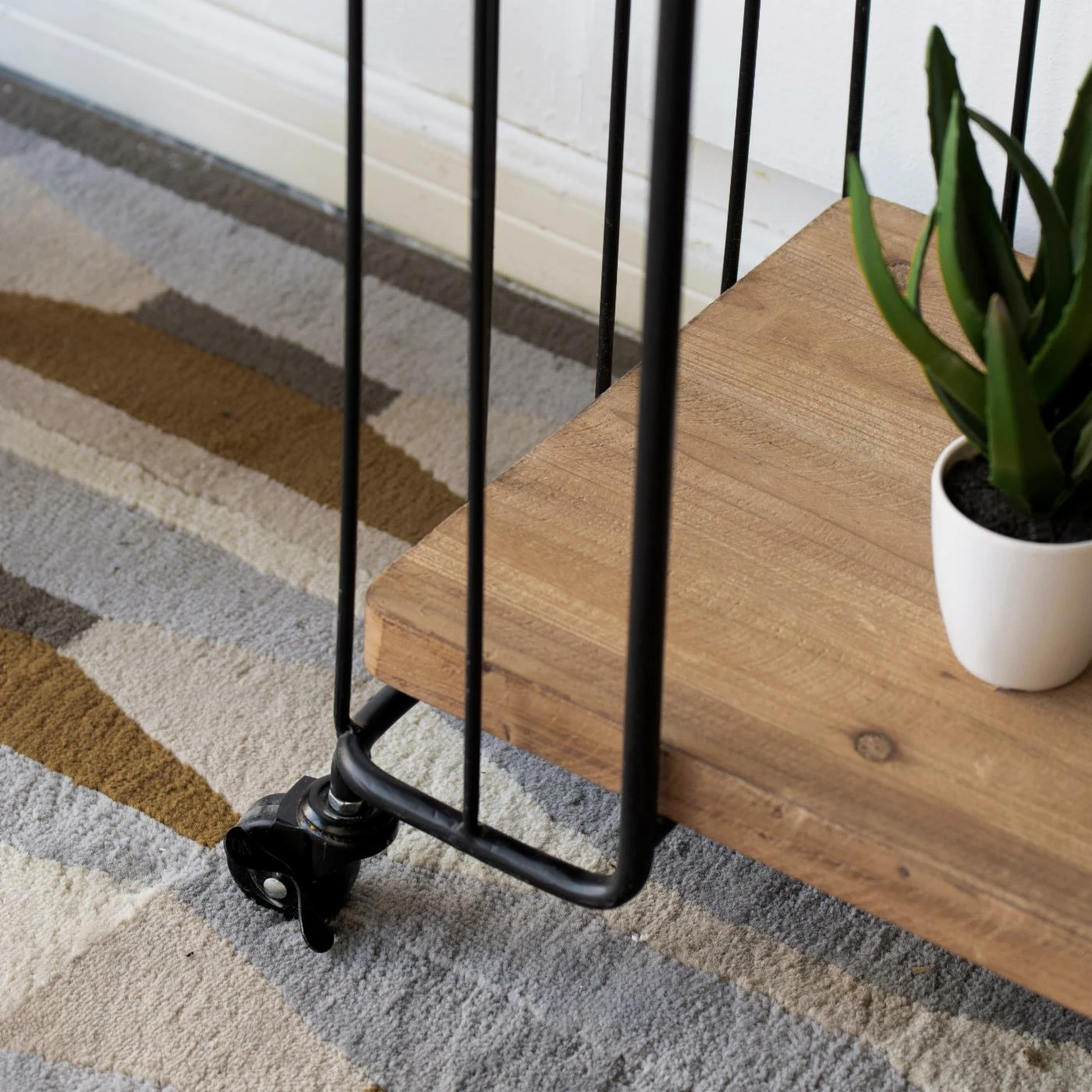 - Engineered wood shelves with solid iron frame