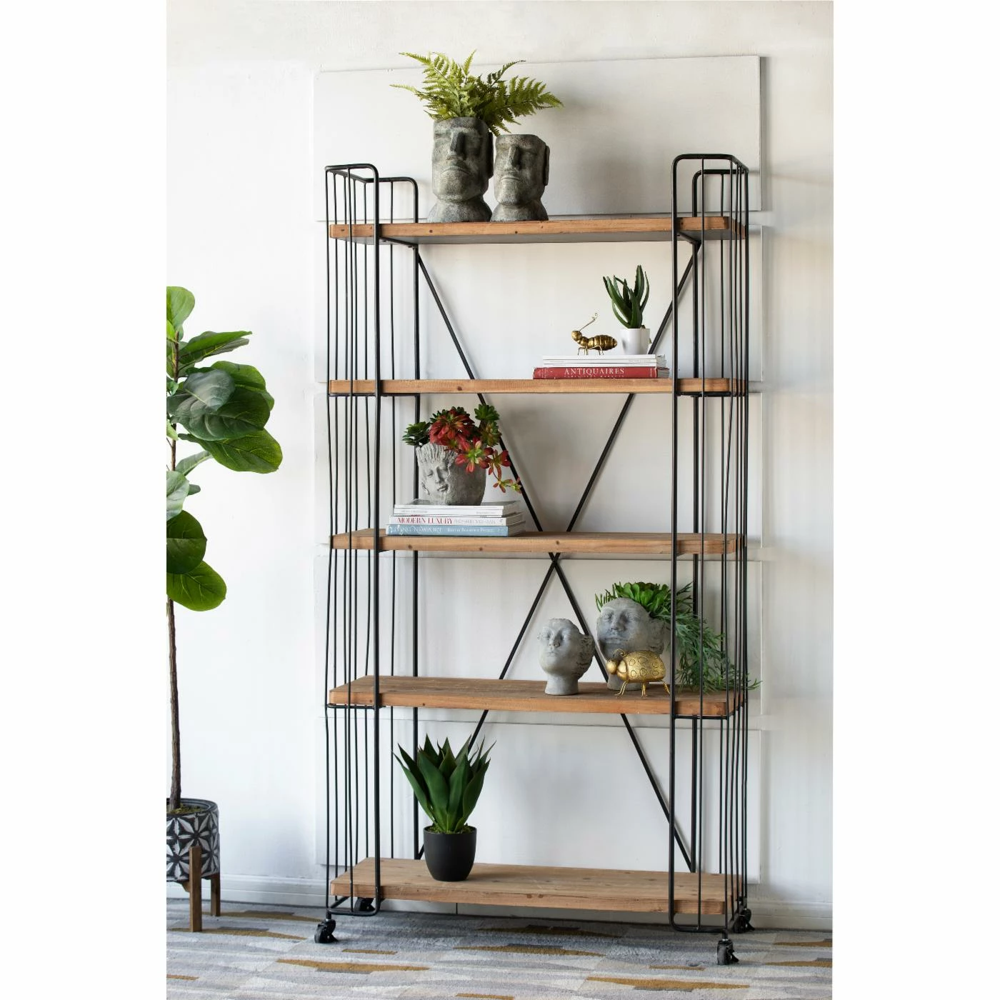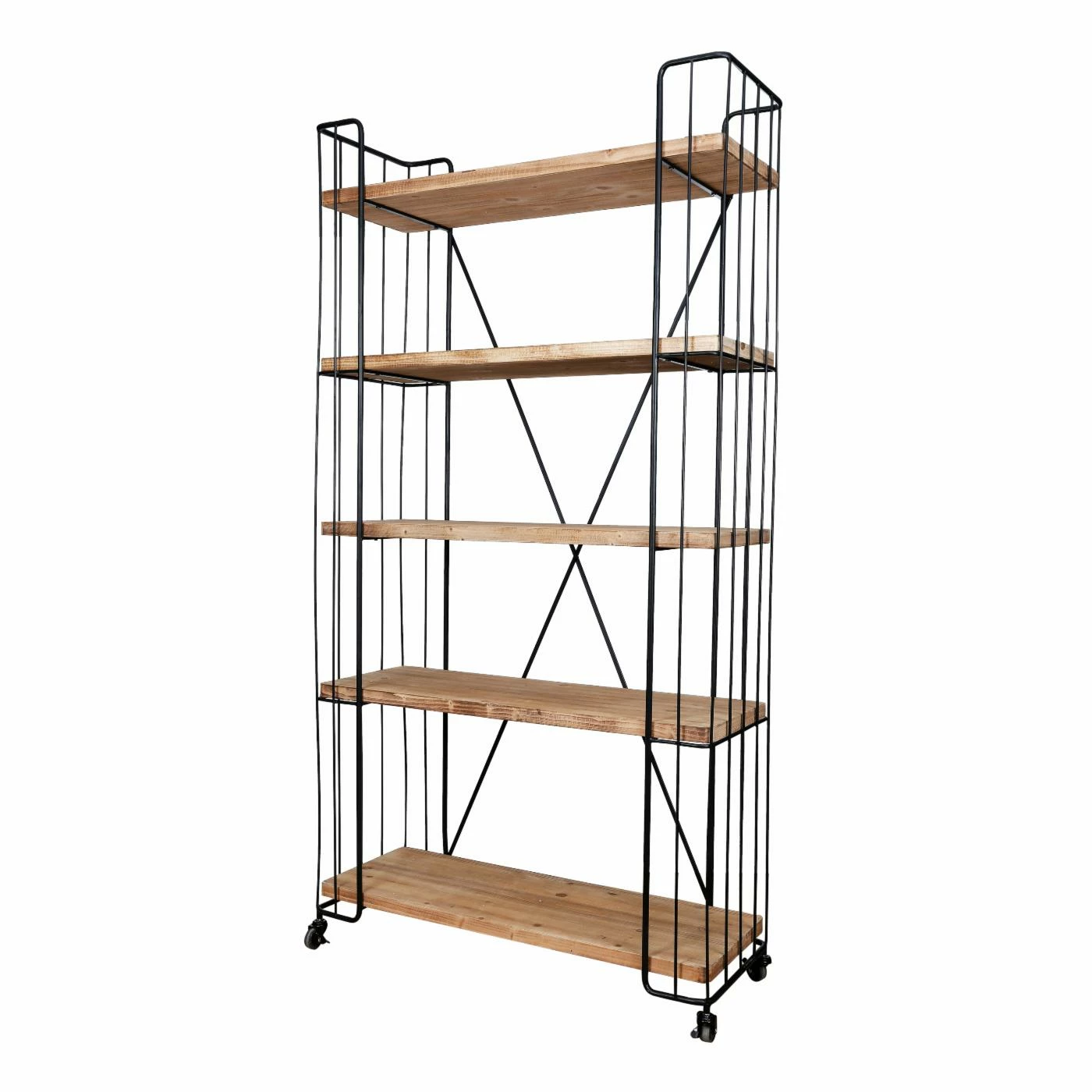 Your library of books or media will be ready to roll on the A and B Home Bookshelf with Casters. The handcrafted sold iron frame rests on four caster wheels that lock when you reach your destination. With five sturdy, engineered wood shelves, the industrial bookcase provides plenty of storage space for your items.