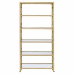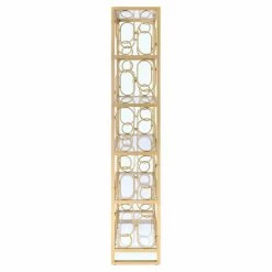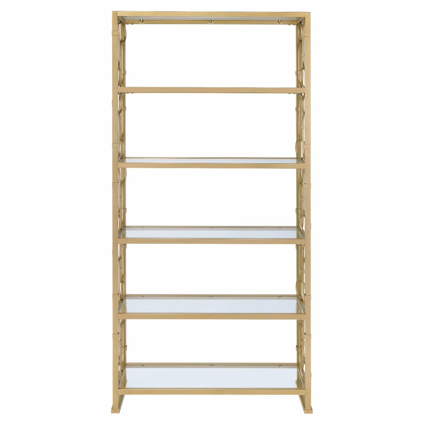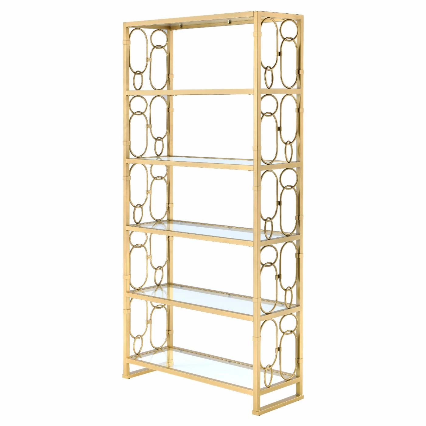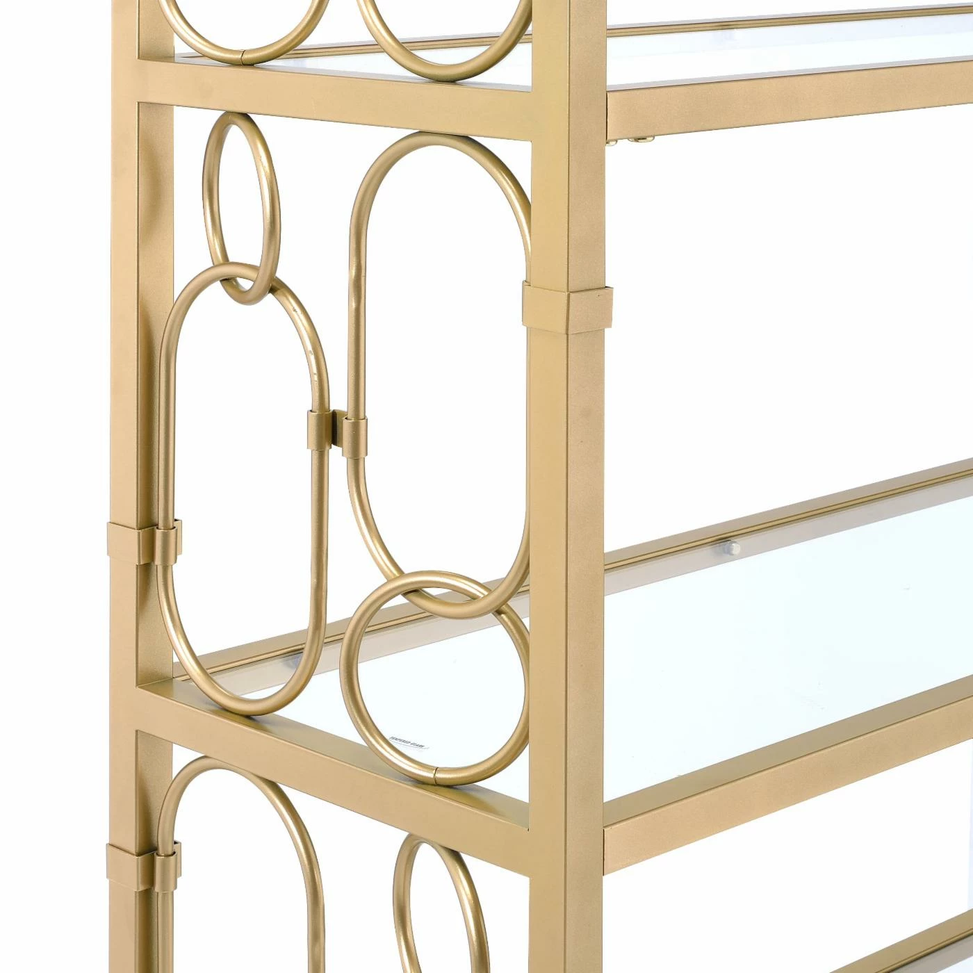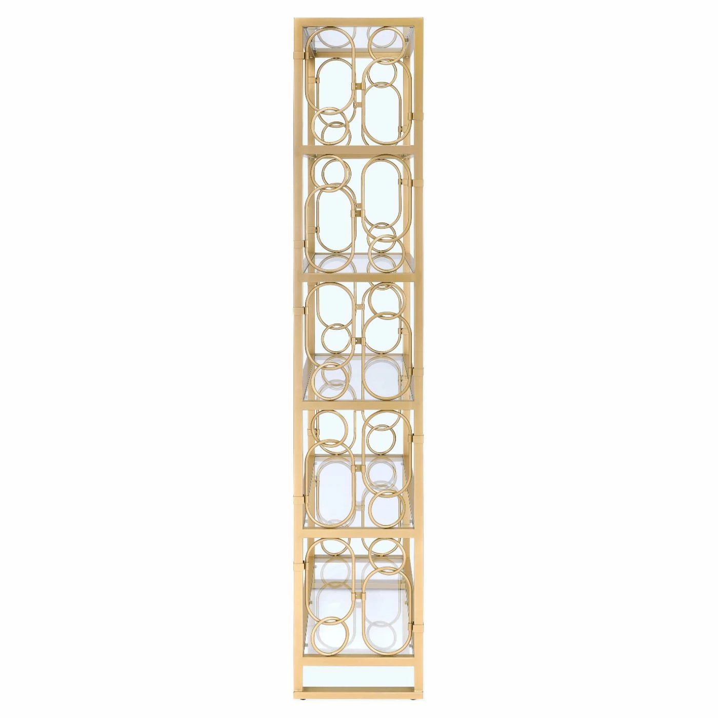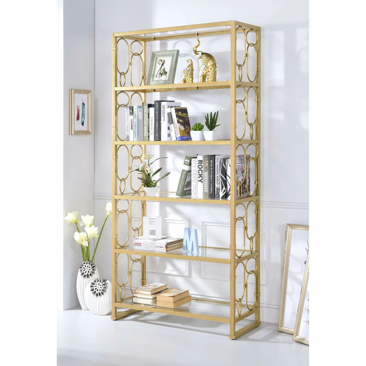 The Acme Furniture Julos Etagere Bookcase blends modern design and everyday function together with sturdy glass shelves and a metal frame. This chic bookcase is enlivened with a unique design that features interlocking circles along the sides for a contemporary look. The gold finish brings it a glamorous, metallic touch.