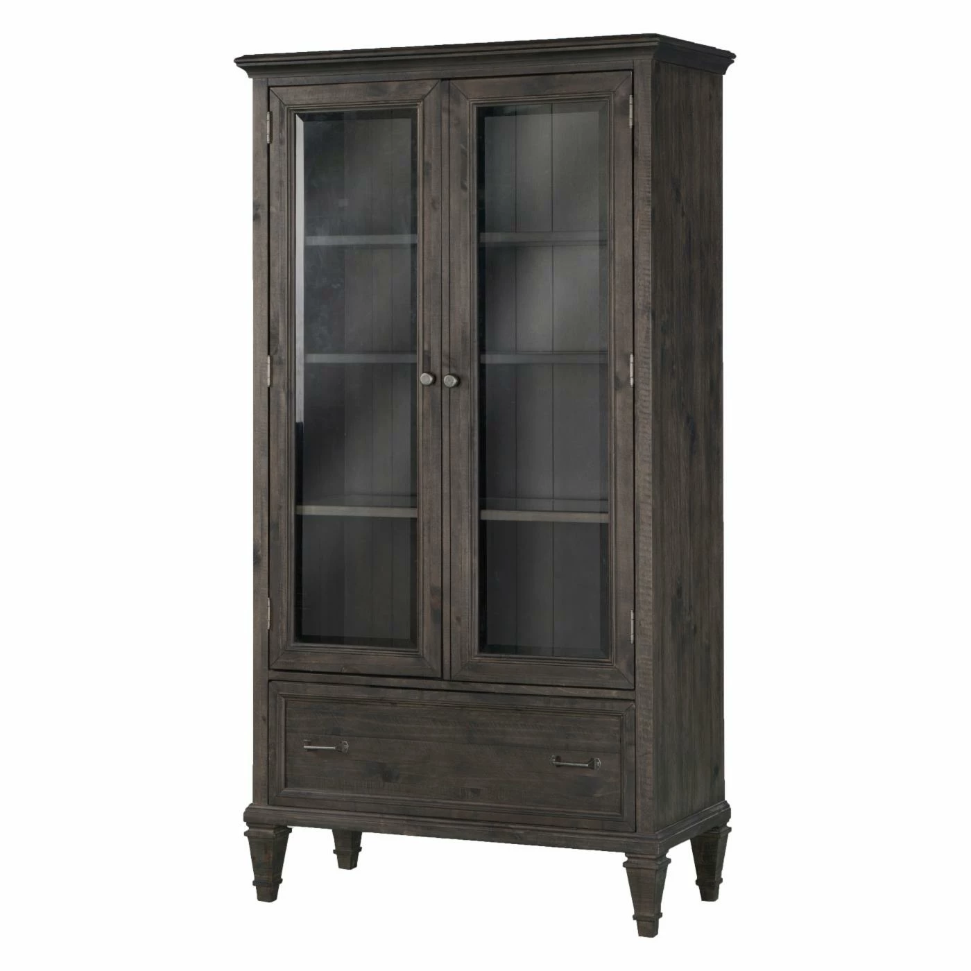 Books, binders, favorite keepsakes – whatever you store in your home office, the Magnussen Sutton Place Door Bookcase makes it easy and look elegant. Inspired by continental European designs, this rustic bookcase is crafted of pine solids and veneers in a weathered charcoal finish. The two doors feature one-inch beveled, tempered glass, while inside, two adjustable shelves and one fixed shelf offer ample storage space. Below, the large drawer features dovetail joinery, tinted interiors, dust proofing, and side-mount ball bearing guides. And you’ll love how two LED lights, complete with three-way touch lighting control, illuminate the bookcase’s interior.