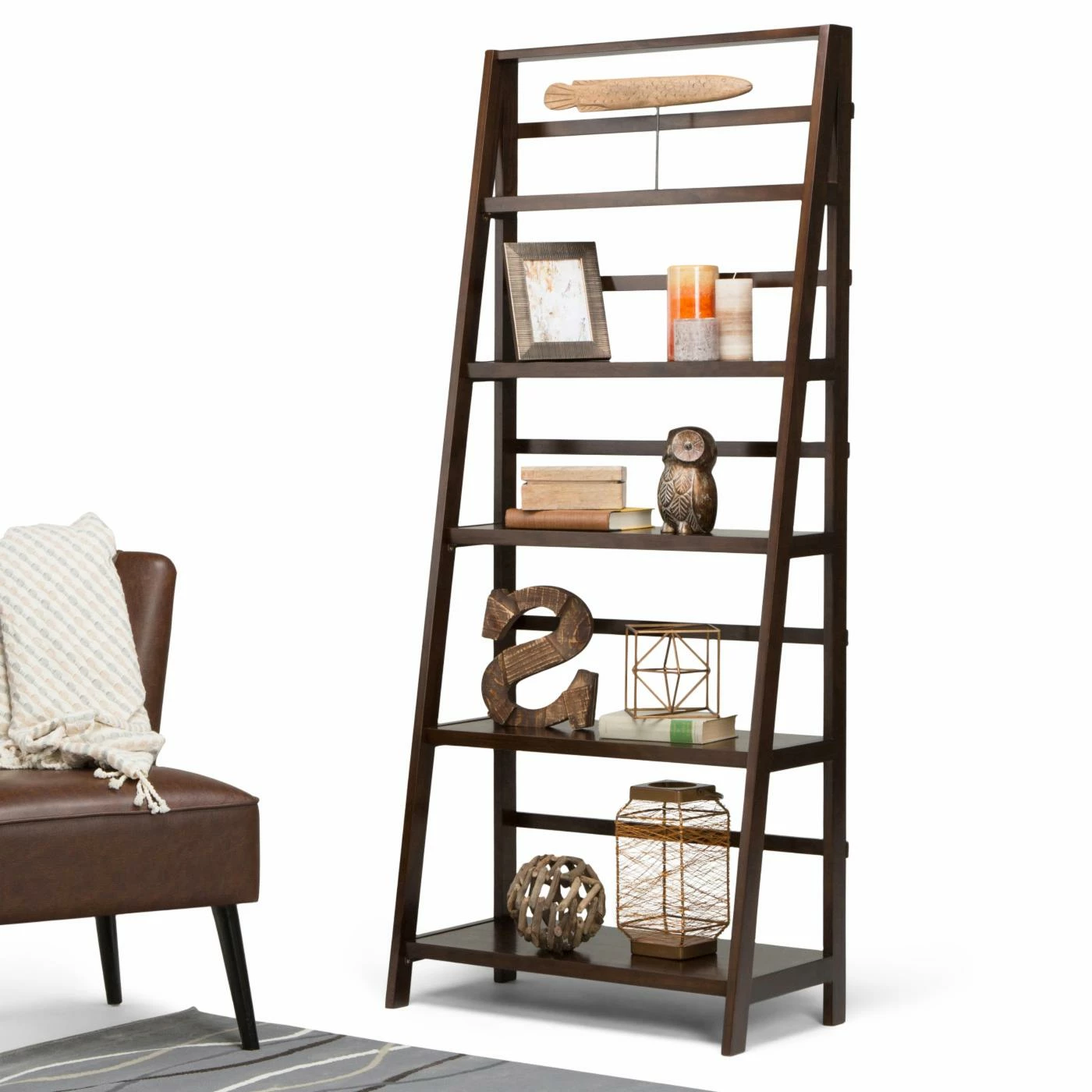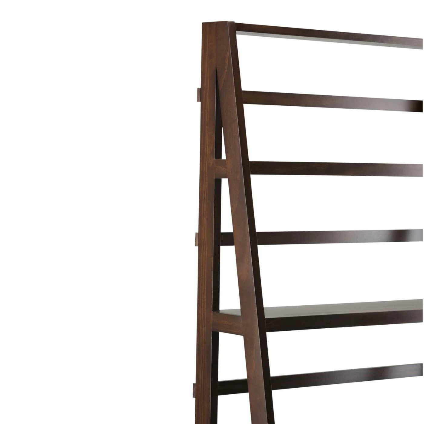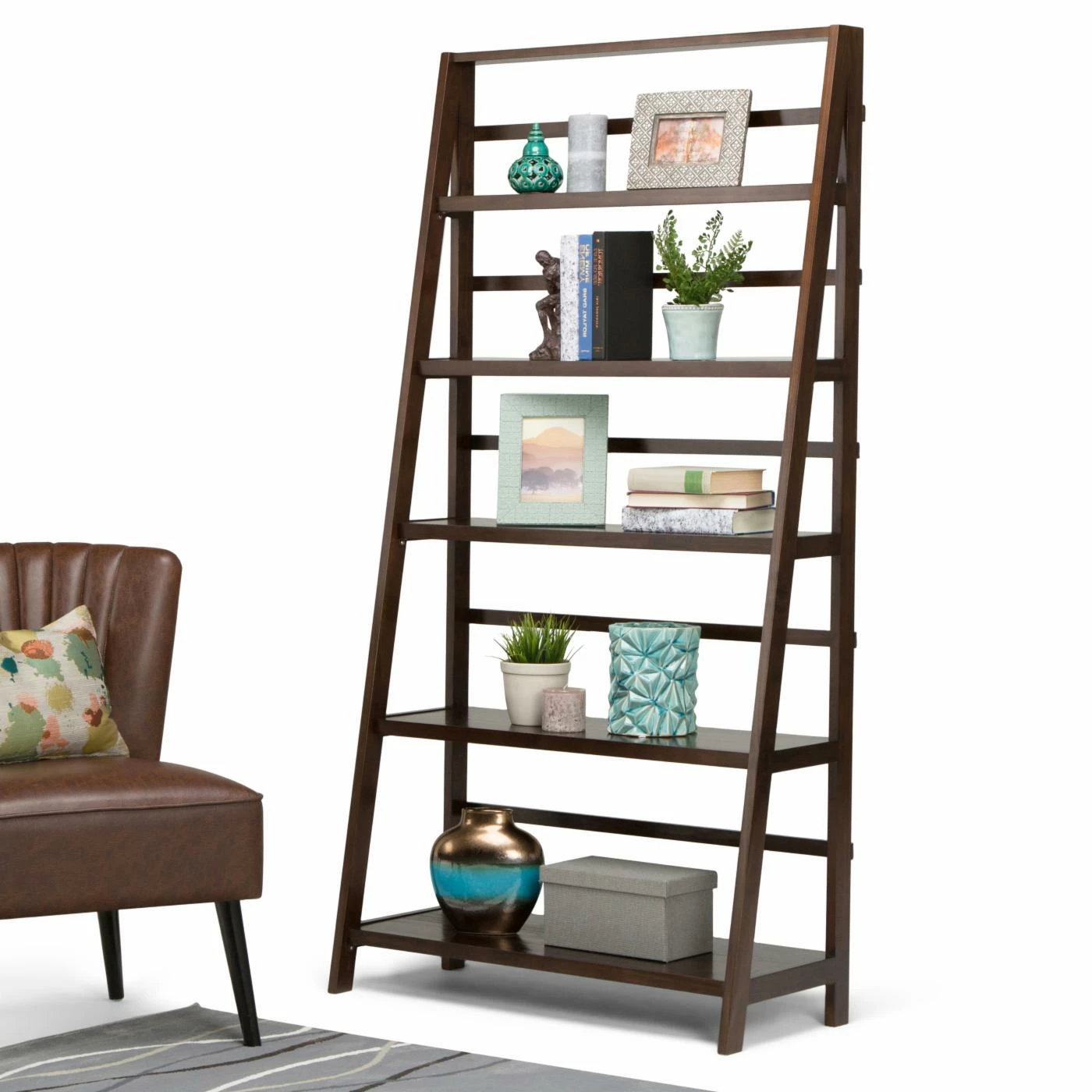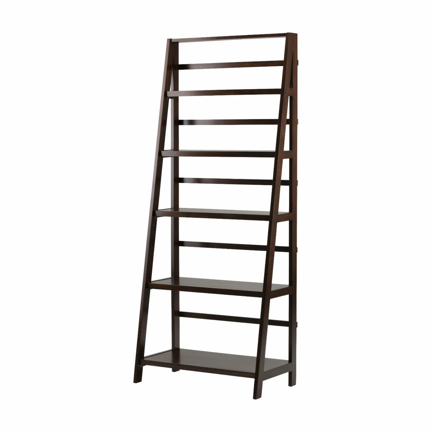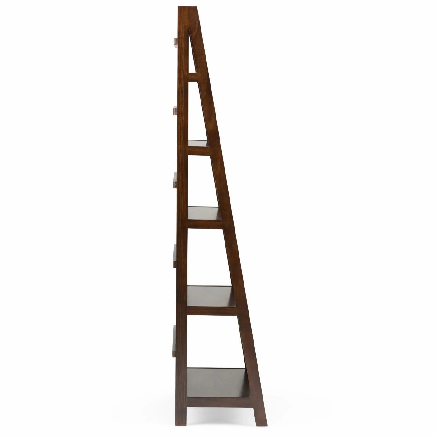 Offer your living room a versatile space to arrange and store any number of items with the Brooklyn + Max Brunswick Rustic Pine Bookcase – Tobacco Brown. This ladder bookcase features a wide base that tapers into a point as it reaches the top. Five total shelves are incorporated into the design, with the widest at the base and narrowing with each subsequent shelf. Durable pine hardwood constructs the piece, which is finished in an appealing tobacco brown. Whether as an open, minimalist curio display space or a bookcase for your favorite volumes, this bookshelf is a crowd-pleaser.