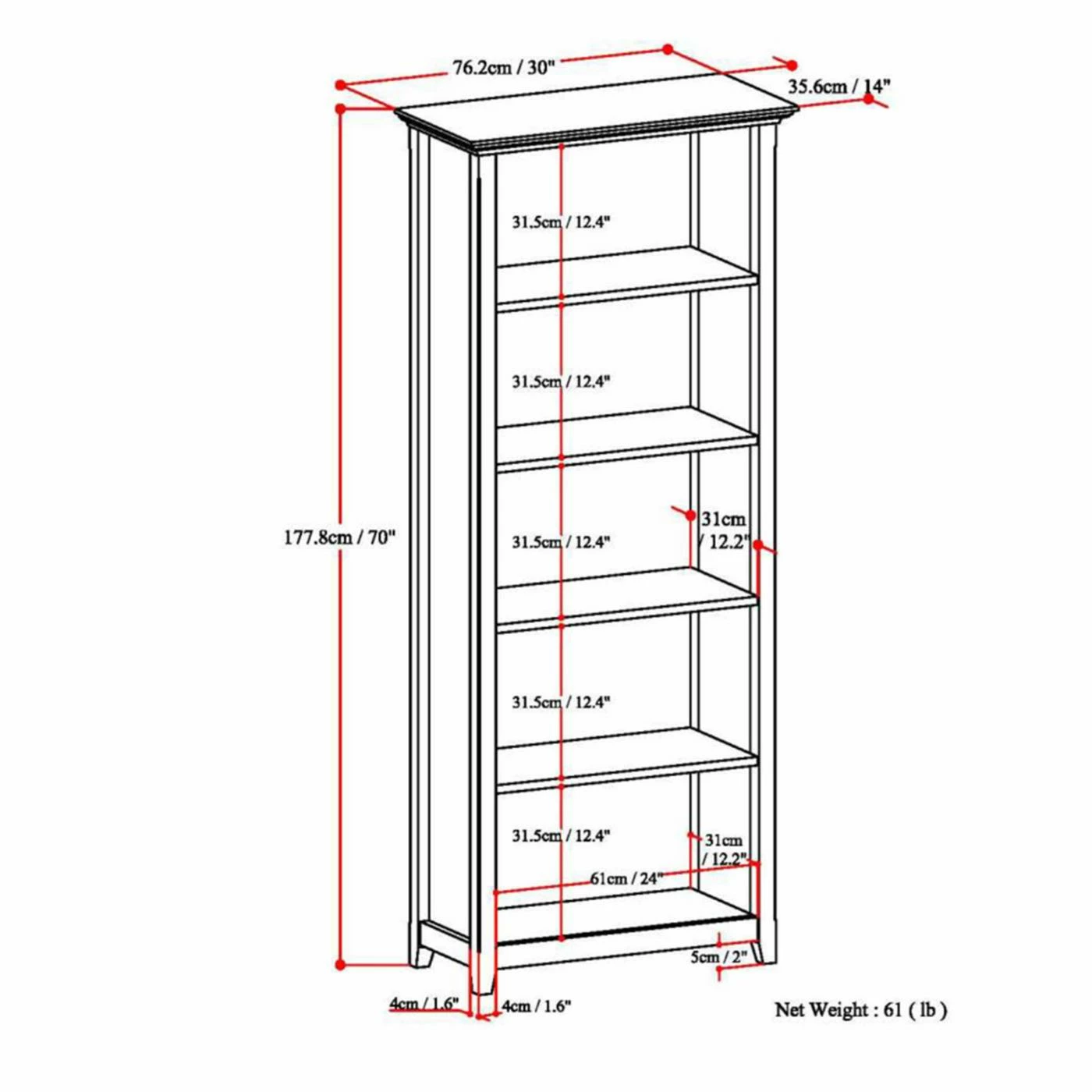 - Overall dimensions: 30W x 14D x 70H in.