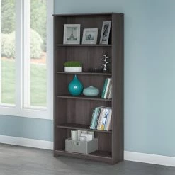 For a timeless, smart choice for storage and display, the Bush Furniture Cabot 5 Shelf Bookcase is the perfect piece to coordinate with your room dΓ©cor. It comes in your choice of available finish to appeal to your exact taste and features a total of five shelves. Three shelves are adjustable to fit your storage needs and flexibility, while two are fixed for stability. This elegant, classic bookshelf is solid and made of durable veneers to resist stains, watermarks, and scratching. This bookcase is tested for anti-tip stability.