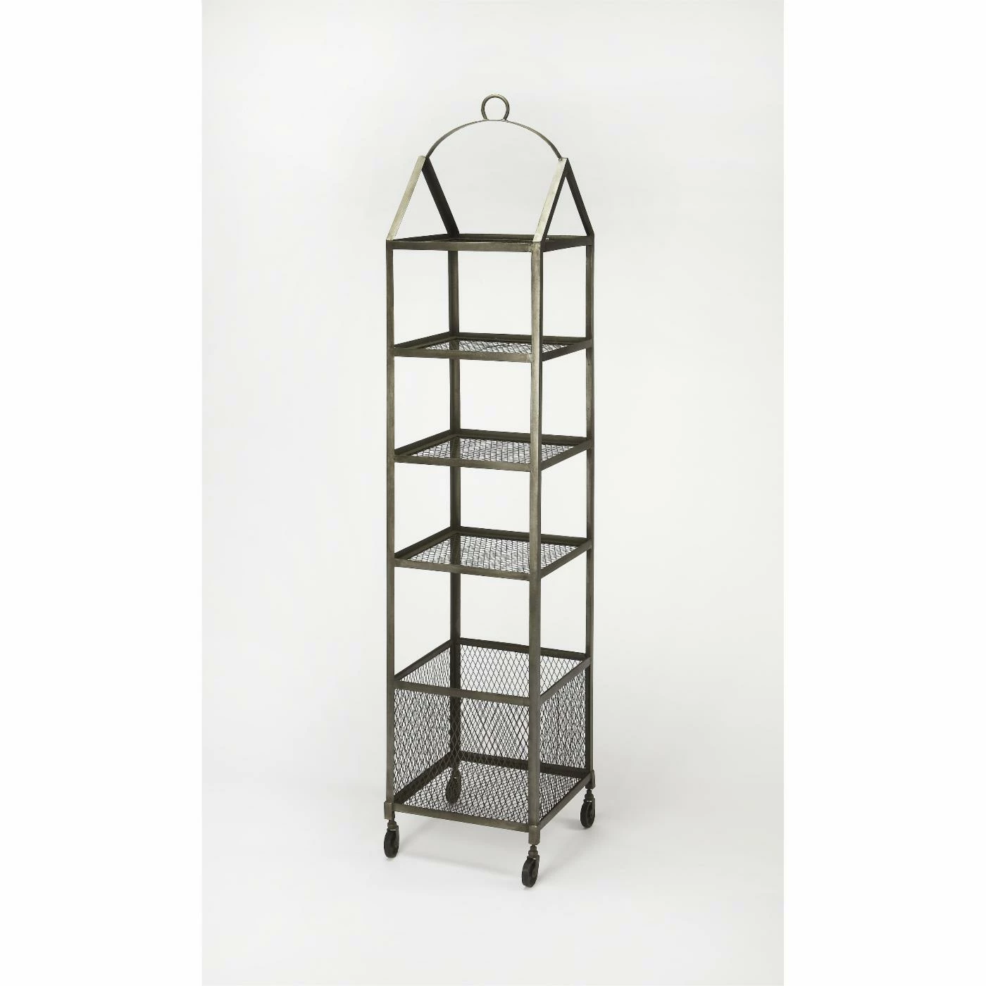 Stellar steel construction makes this Butler Industrial Chic Trammel Etagere Bookcase – Gray a durable and eye-catching addition to your home. Finished in a soothing gray hue, this bookcase is equipped with four iron mesh shelves for storage. The wheeled design makes it conveniently mobile.