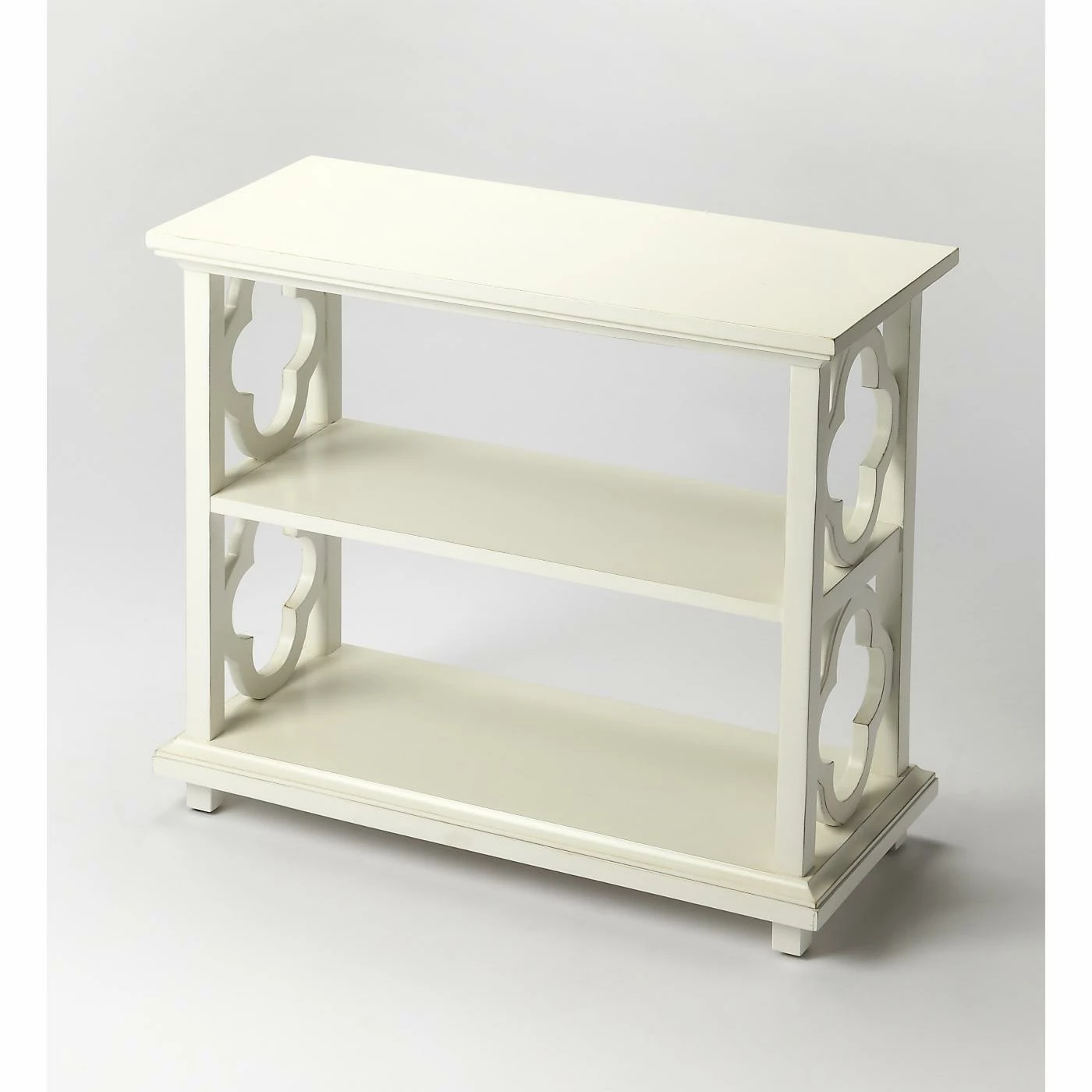 Featuring quatrefoil sides, this Butler Masterpiece Paloma Open Back Bookcase – Cottage White is a stunning and useful addition to a den, living room, or even a home office. Made of durable engineered wood and cherry veneer, this heirloom-quality bookcase is finished in cottage white. Two open shelves give you space to display books, decorative items, framed photos, and more.