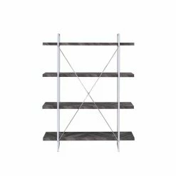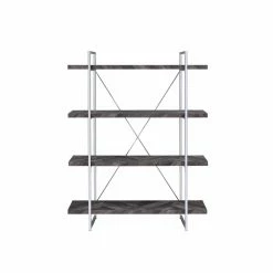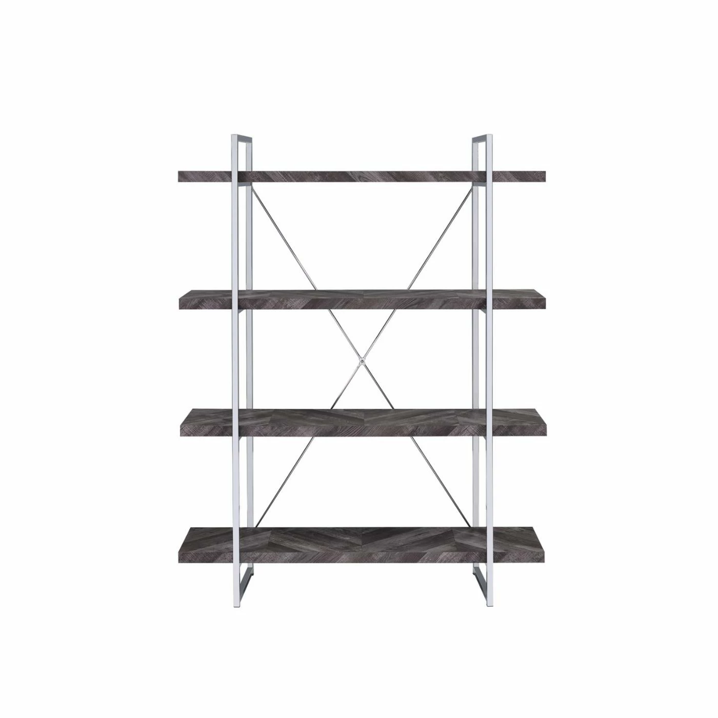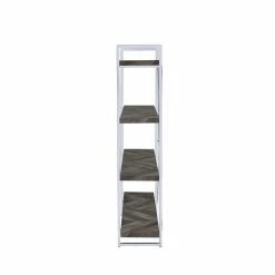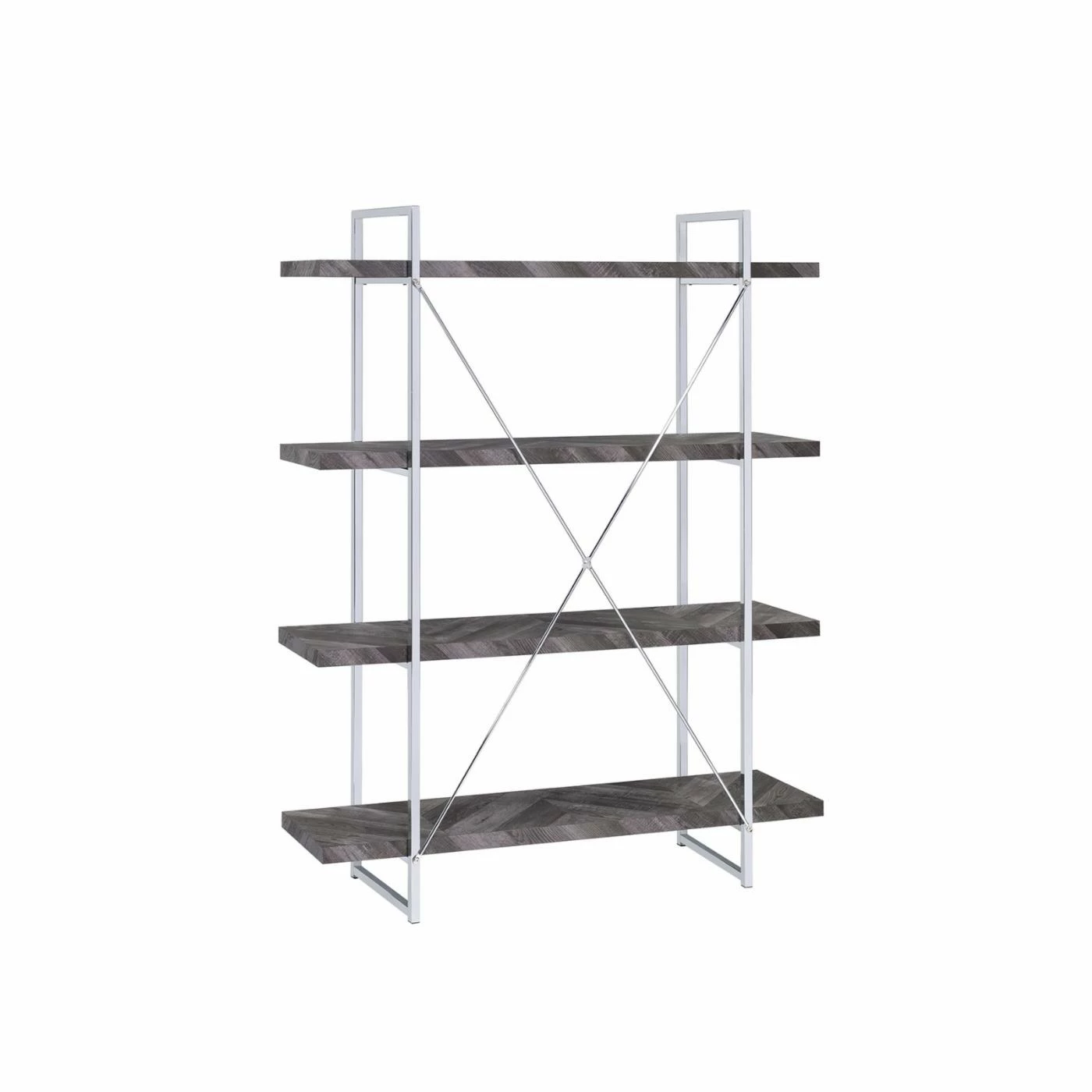Perfect for storage or display, the Coaster Furniture Grimma Decorative Bookcase – Rustic Grey Herringbone exudes understated glamour. Its frame is comprised of crisp, clean metal lines with an eye-catching, x-shaped design on the back. Its shelves are crafted with high-quality wood for added sturdiness and durability. A rustic gray herringbone finish blends beautifully with the high-shine chrome finish of its frame. With its simple yet stately design, this contemporary bookcase is a stunning addition to any modern home.