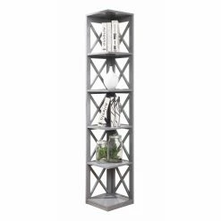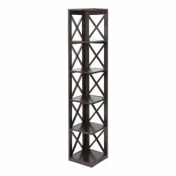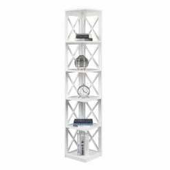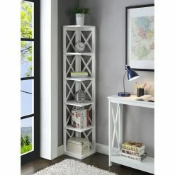 Tuck this Convenience Concepts Oxford 5 Tier Corner Bookcase into any corner to instantly add stylish display without sacrificing floor space. The top plus five lower tiers provide plenty of room to showcase some of your favorites. This corner bookcase features open X-shaped sides and is available in your choice of finish.