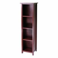Let your organizational skills stand tall and proud in the Winsome Verona 4-Section N Storage Shelf Bookcase with 4 Foldable Black Color Fabric Baskets. Its casual-cool attitude can mirror your own in the living room or the bedroom alike. Rich, dark wood solids and veneers hold four foldable, black fabric baskets tricked out with easy-to-use handles ideal for magazines, books, toys, blankets, or clothes. The slim design fits neatly into any corner. If you like, fill the shelves alone and tote the baskets to other areas that need extra storage.