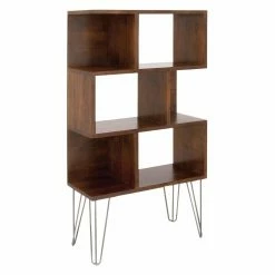 Perfect for the modern living room, the DecMode Decorative Wood And Iron Bookcase features an alternately stacked storage design for a contemporary feel. Each of the three shelves is divided into open and closed back compartments, creating a unique look that offers ample storage space. Crafted from albizia wood, the body of this bookcase is finished in a rich brown color. Four hairpin legs support the design, and boasts a silver finish to complete the look.