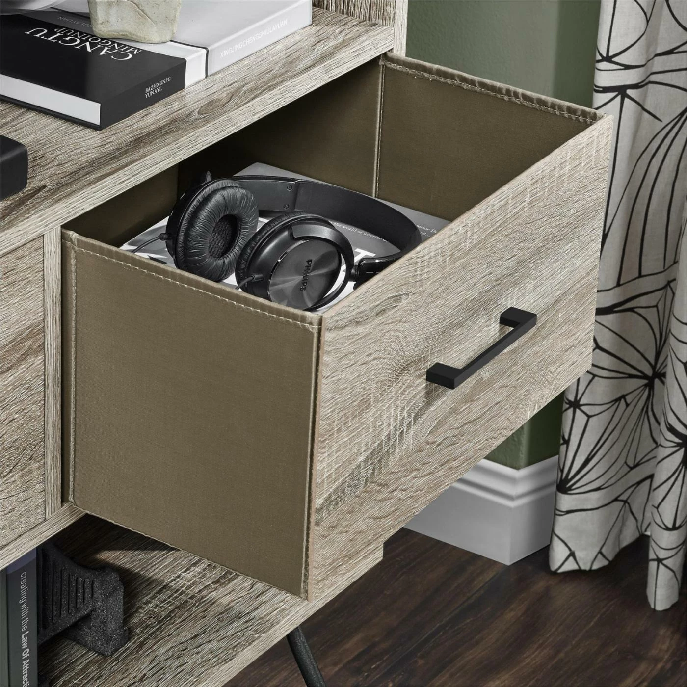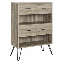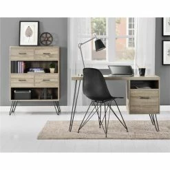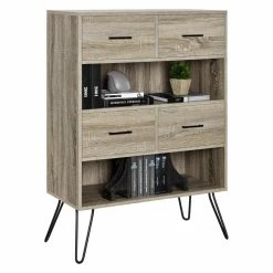 Hairpin legs in gunmetal gray give this Ameriwood Home Landon Bookcase with Bins – Sonoma Oak / Gunmetal Gray its retro appeal. The modern design of this bookcase includes four total shelves. Two of which house the four fabric bins with genuine wood grain fronts. These fabric back, wood front drawers may be removed and easily stored for later use. The Sonoma oak finish pairs well with the gunmetal gray legs and sleek bar pulls.