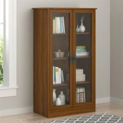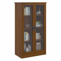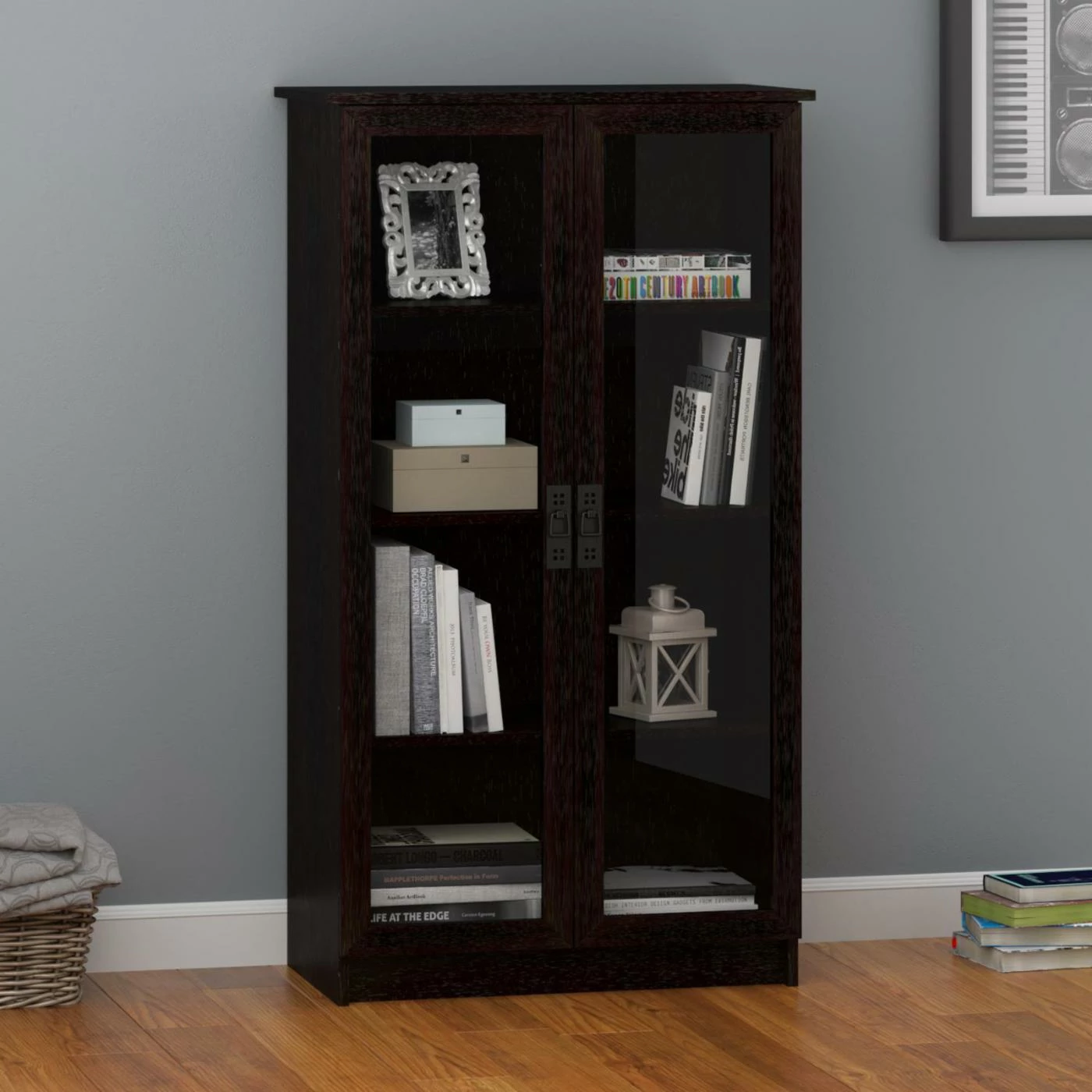 Dark metal rectangular ring pulls with backplates give this Ameriwood Home Quinton Point Glass Door BookcaseΒ its mission appeal. It’s built of laminated engineered wood and particleboard in a rich finish in your choice of color. This bookcase offers four shelves tucked behind its two tempered glass doors.