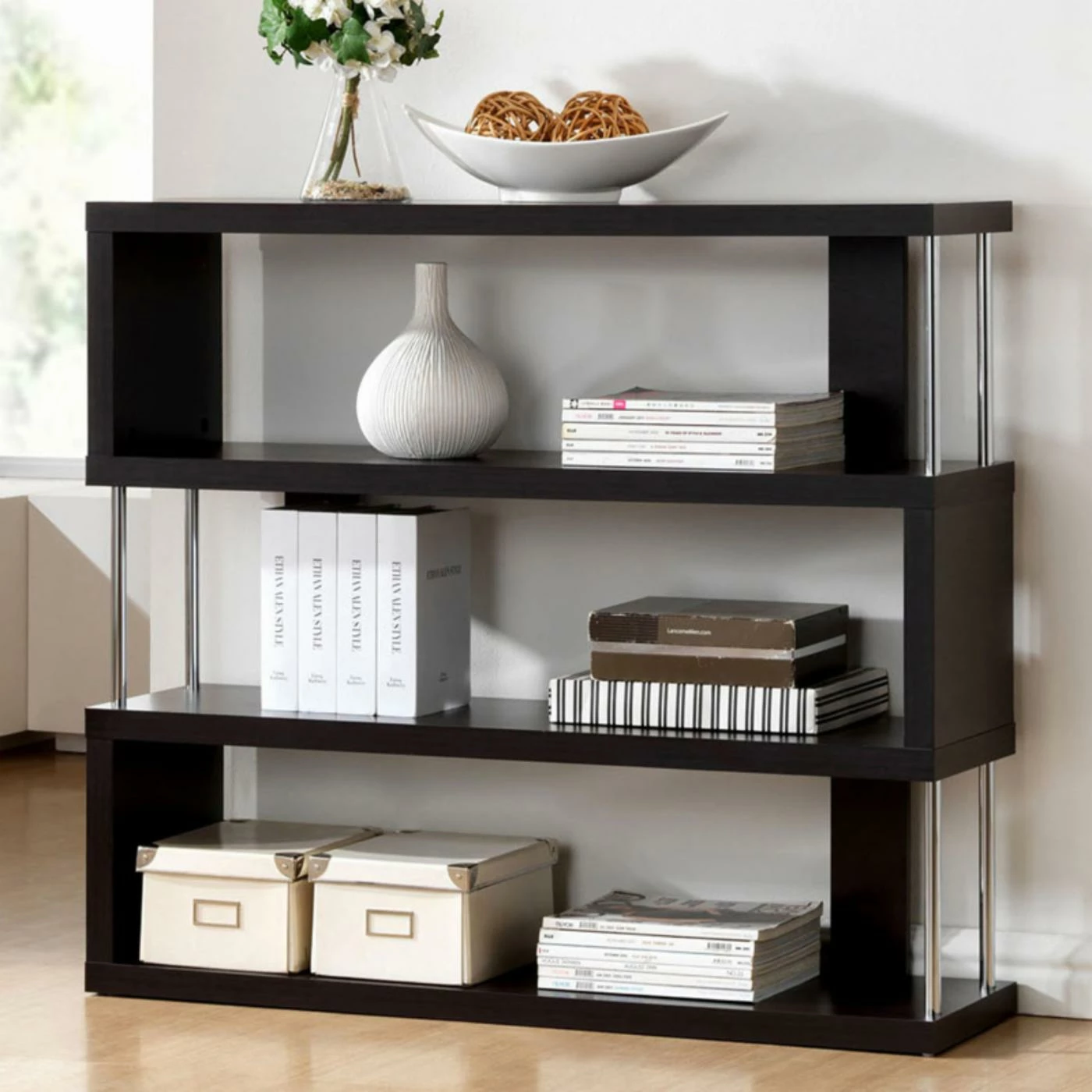 Bring sleek, modern style to your library with the Baxton Studio Barnes 3 Shelf Bookcase. Tubular steel supports add strength and a touch of shine to the engineered wood bookcase. The piece features three open shelves with an asymmetrical design that boosts the contemporary appeal of living spaces.