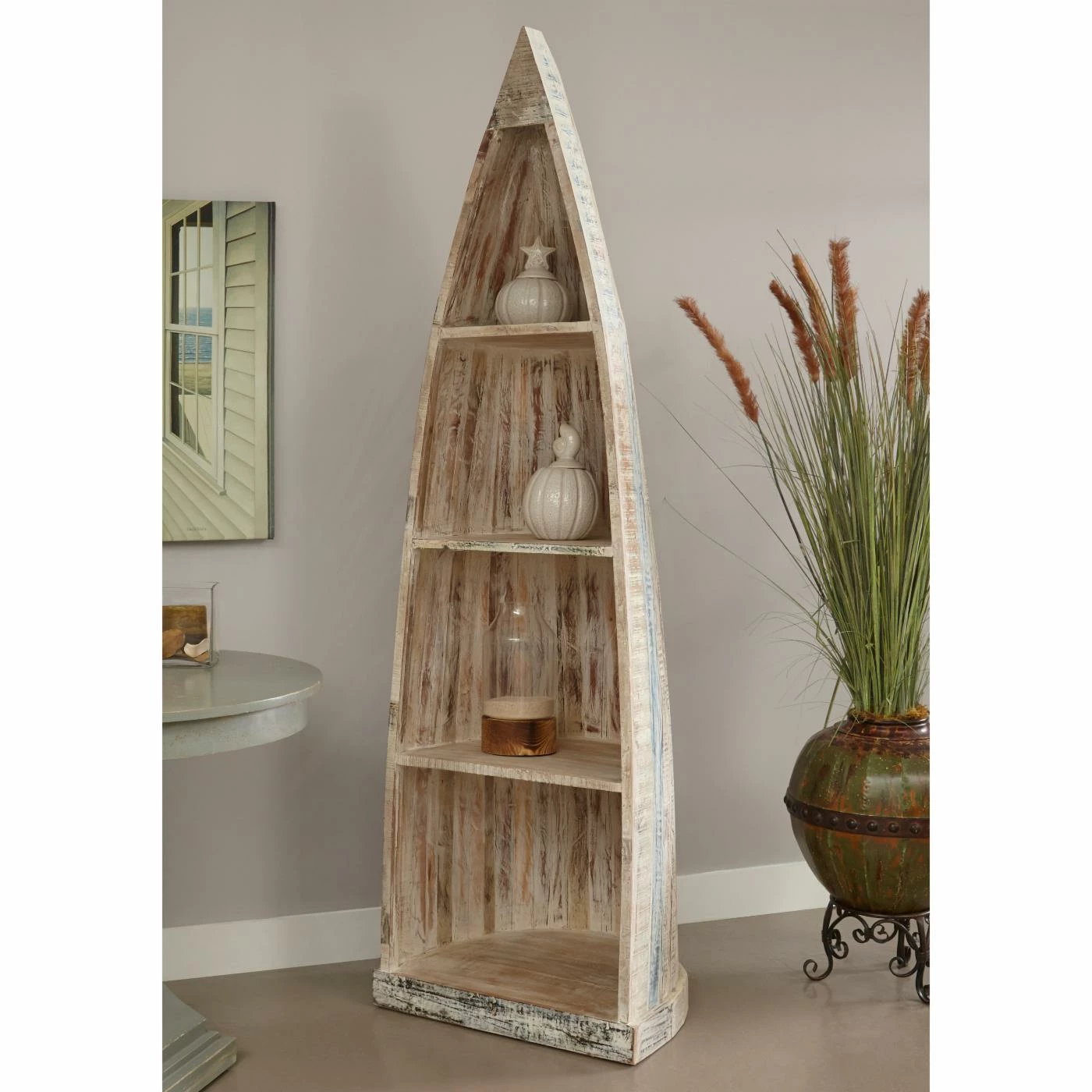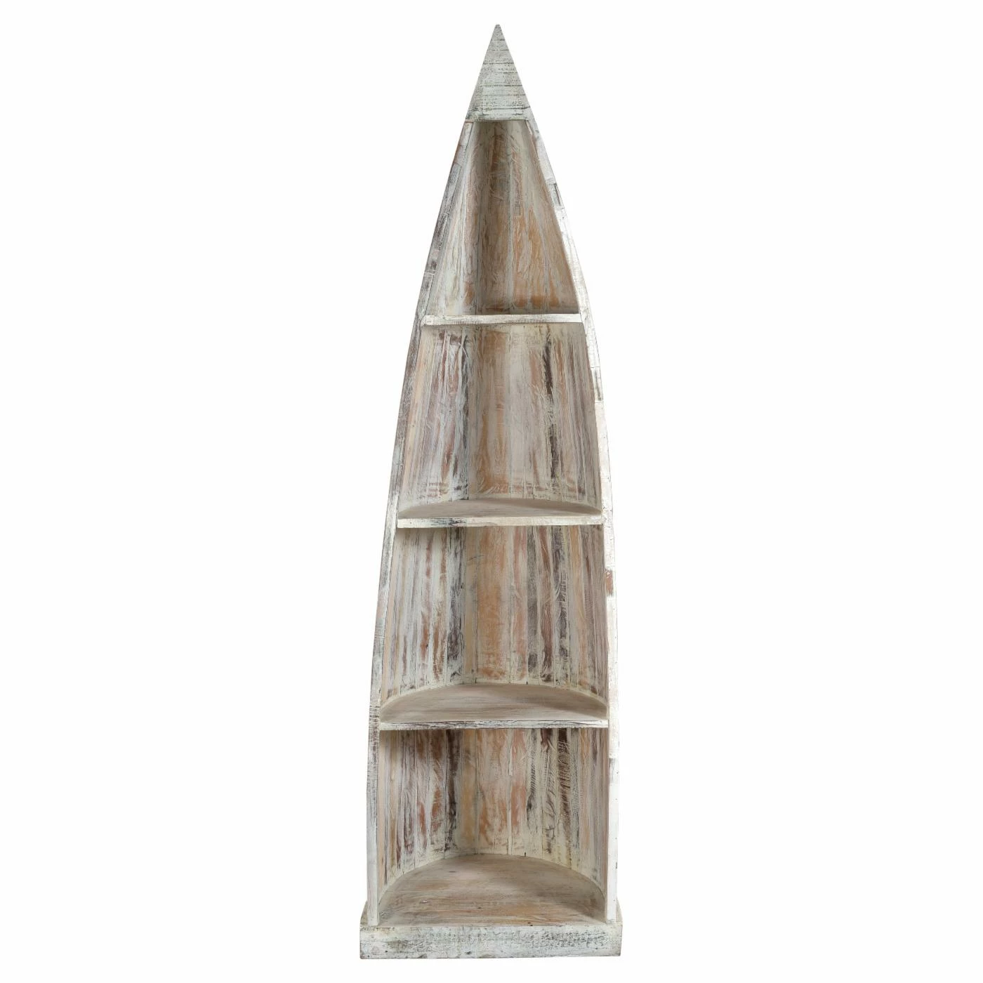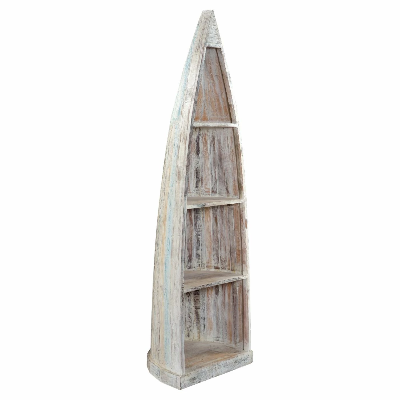 Look out, lake house! The Coast to Coast Nautical Boat Bookcase stows favorite books while bringing woodsy, rustic charm into your space. The inspiring vaulted shape of this bookcase allows it to nestle into a corner. Or purchase a pair and have them flank your desk or fireplace. This bookcase is crafted of solid mango wood and is finished in a beautiful lagoon blue finish that’s lightly whitewashed and rubbed through. Fixed shelves are evenly spaced.