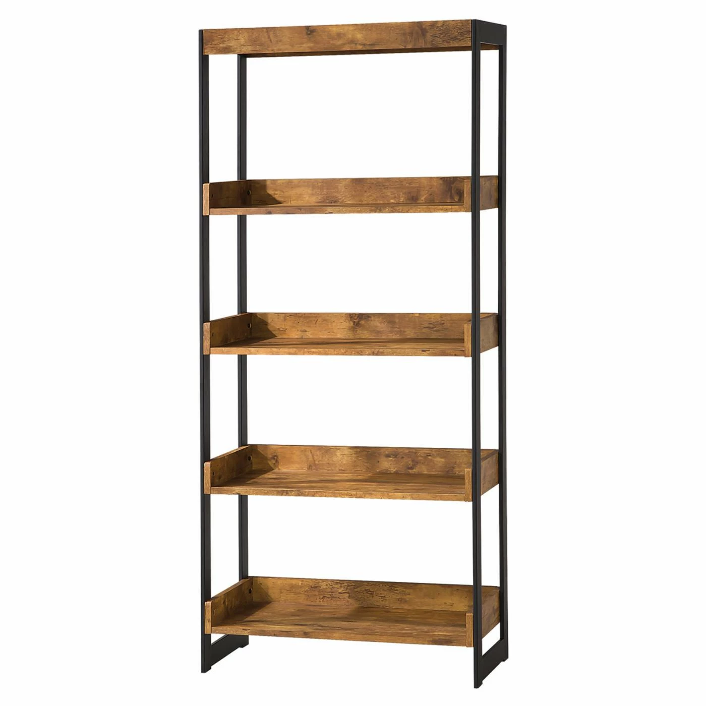 Four shelves constructed with short sides and backs for stability and support of your personal items make this Coaster Furniture Estrella Bookcase dependable and stylish. Designed in a rustic and transitional style with a touch of southwestern flair, this bookcase comes with four shelves in all, featuring a stylish open-back construction. Display family photos, your book collection, potted plants, or a vinyl record collection. The shelves are supported by a bold, black metal frame that complements the woodβs antique nutmeg finish.
