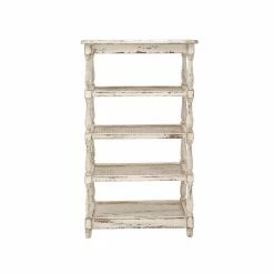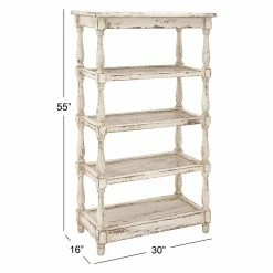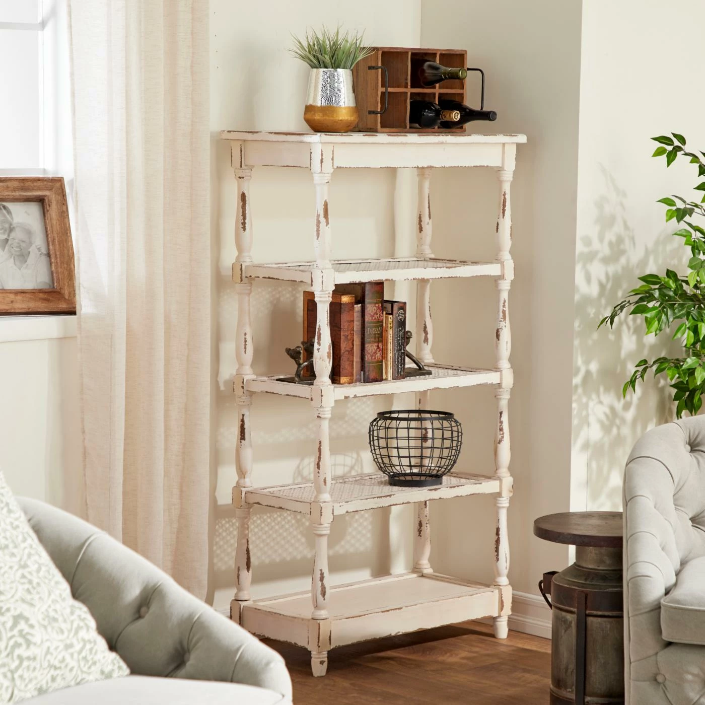 Expand the storage space in your farmhouse interior with the DecMode Rustic Five-Tiered Wood And Metal Cane Shelf. Iron designed to resemble woven cane gives the five shelves of the solid fir and engineered wood furnishing a rustic, textural effect. Heavily distressed, the painted white finish suggests that the shelf has been weathered by time.
