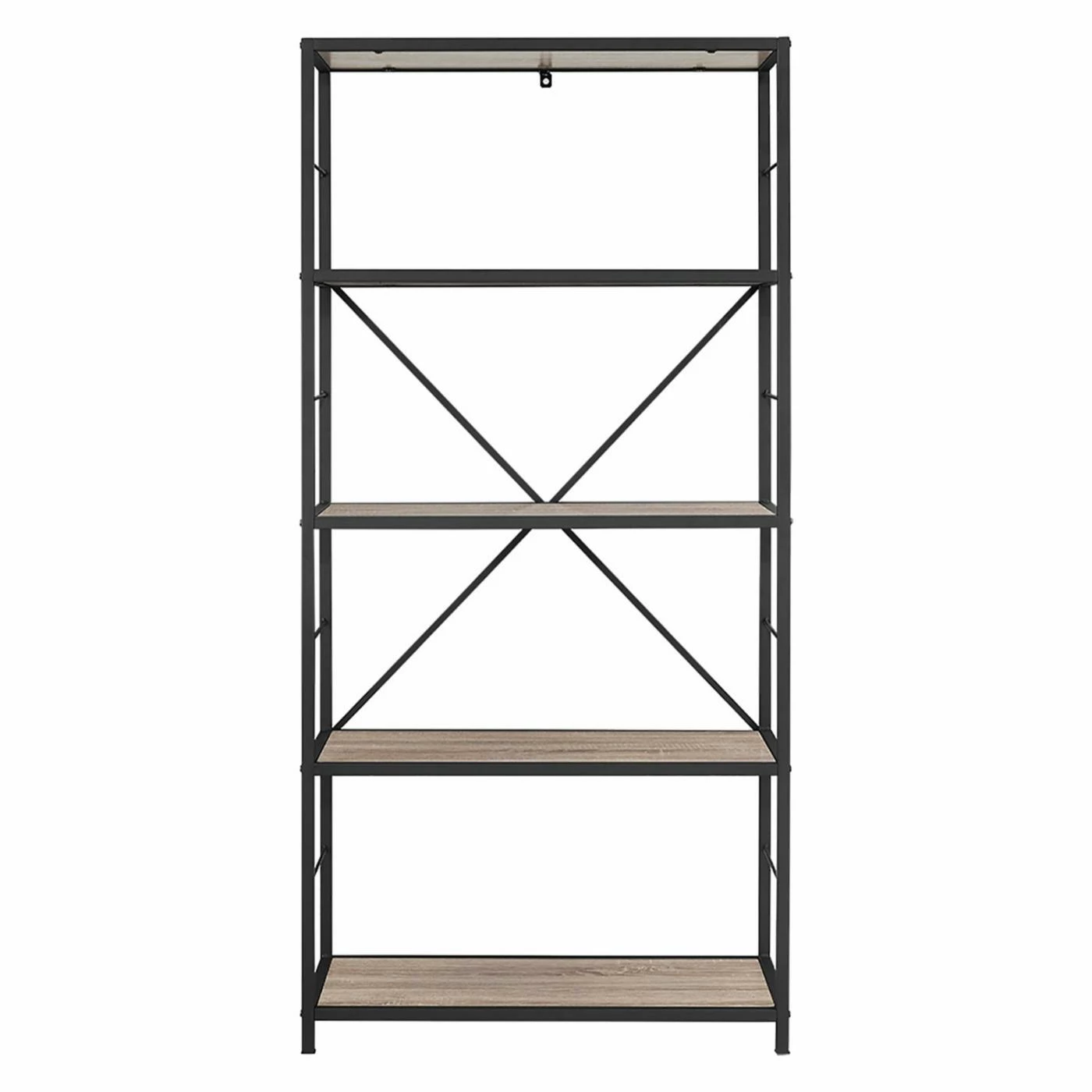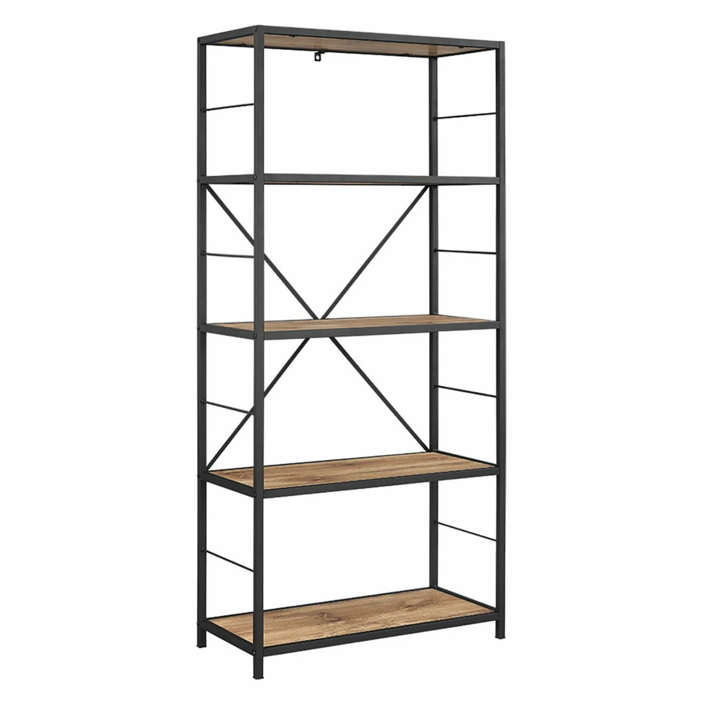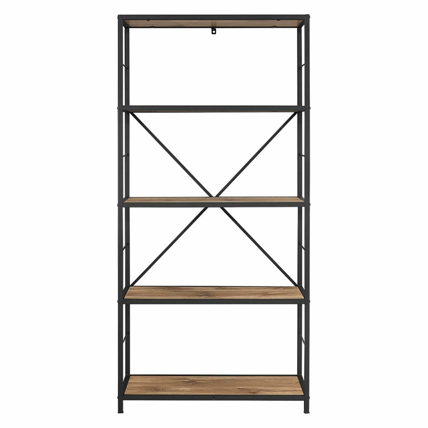 The rich vintage styling of the HumbleNest Countryside 60 in. Rustic Media Bookcase makes for a perfect display piece in your home. The powder-coated metal frame features handsome horizontal and X-shaped supports, and the various shelving layers, made of engineered wood, provide ample space for displaying books, magazines, dΓ©cor, and other essentials.