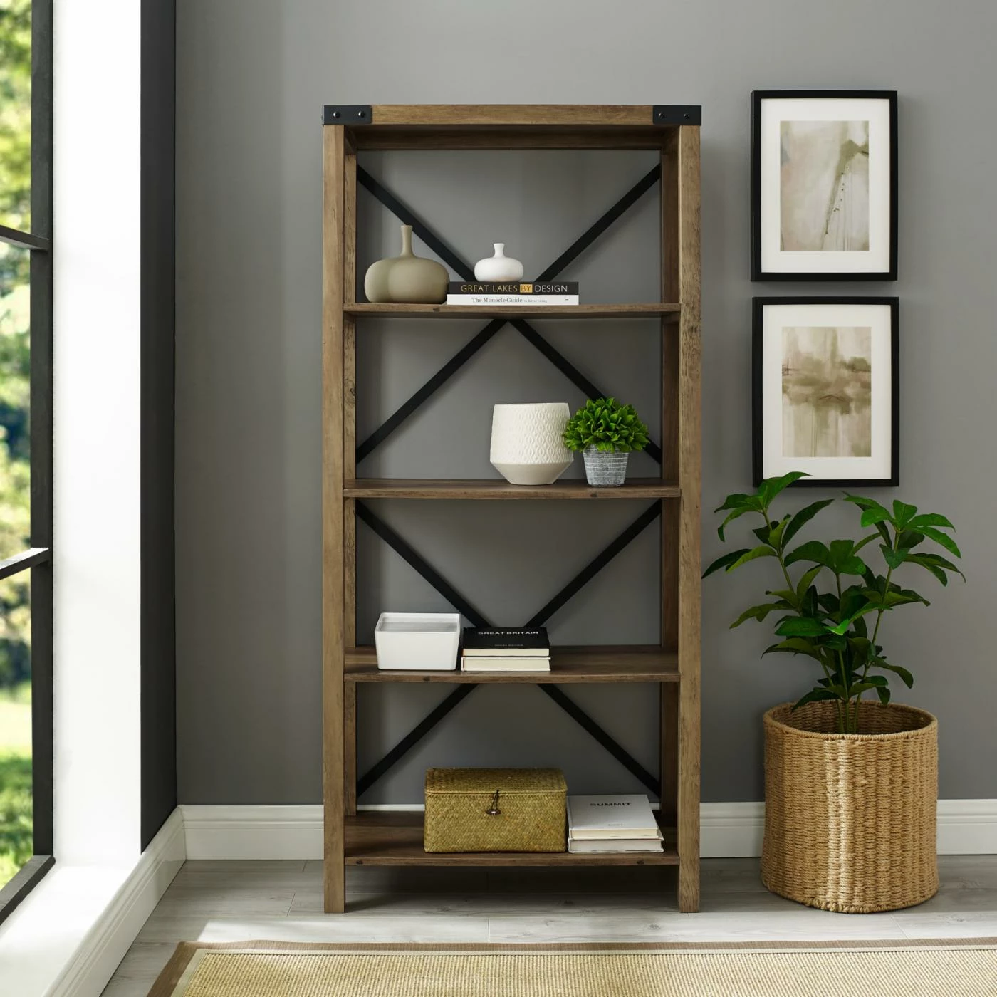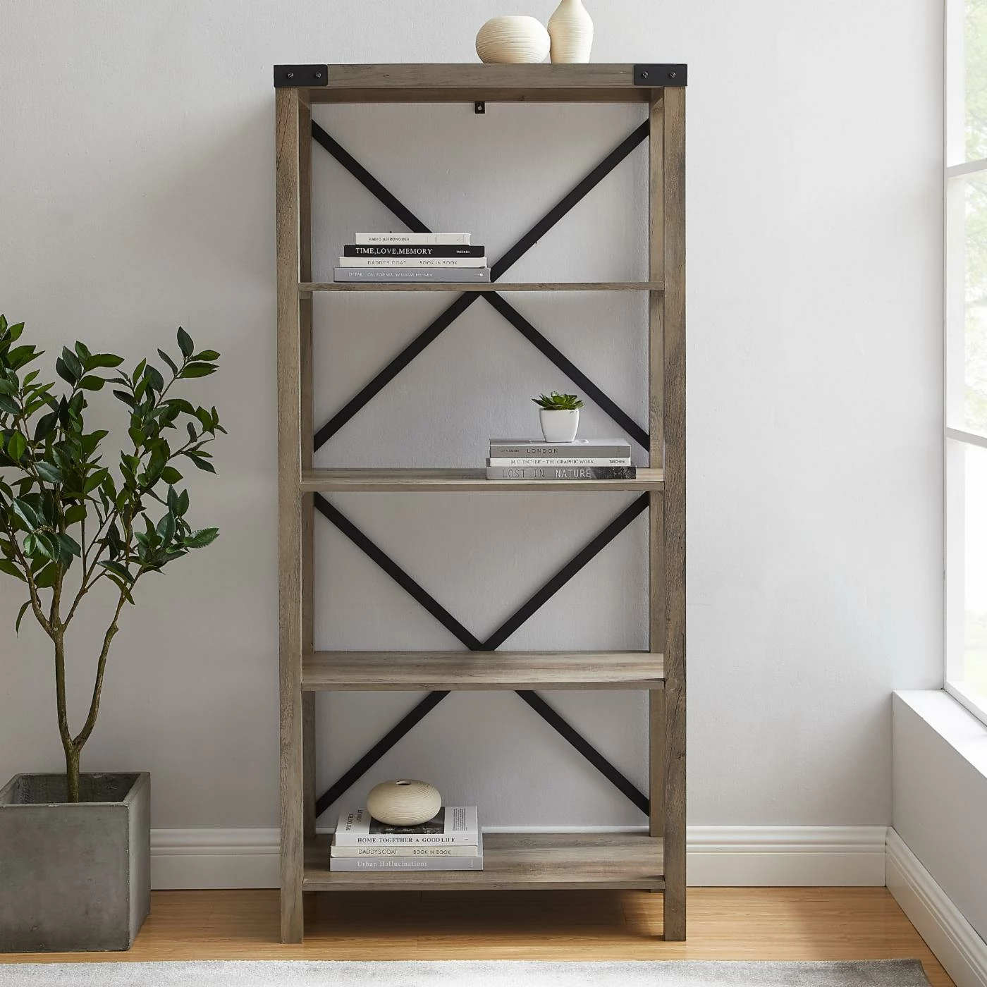You’ll love the spacious design and farmhouse style of the HumbleNest Countryside 64 in. 4 Shelf Modern Rustic Bookcase. Featuring four large shelves with ample space for books, curios, plants, and decorative items, this bookcase is a great addition to any room. Its high-grade engineered wood and laminate construction, along with its X-shaped back design, ensures this piece will last. With your choice of available finishes, you’ll have no trouble complementing your existing furnishings.