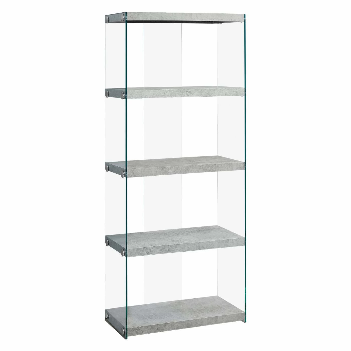 The Monarch Specialties Bookcase with Glass Sides adds a contemporary touch that blends with any dΓ©cor. It features tempered glass sides and five open shelves on which to display books, photos, and other keepsakes. It’s finished in grey with sleek chrome accents.