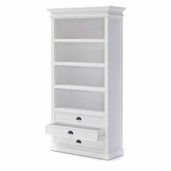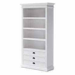 Great for smaller places, the Nova Solor Halifax Bookcase gives your home a look of simple elegance that you’ll love. Combining the charm of the French countryside with the coastal style of the Eastern seaboard, this bookcase gives you ample storage space for your books and decorative items. Hand assembled from solid, kiln-dried mahogany and MDF, the semi-gloss white finish features a light distressing which gives the bookcase a rustic touch. Four shelves are perfect for your favorite novels and trinkets while the three drawers give you space for those items you like to have close at hand but not out in the open. The antique brass hardware provides the perfect finishing touch and gives this bookcase a classic look that goes with almost any decor.