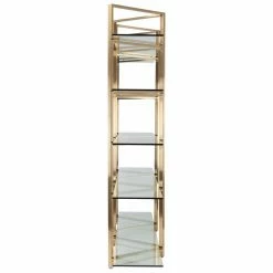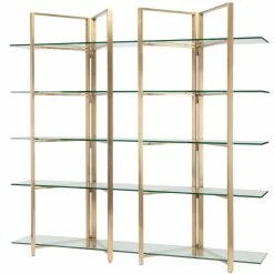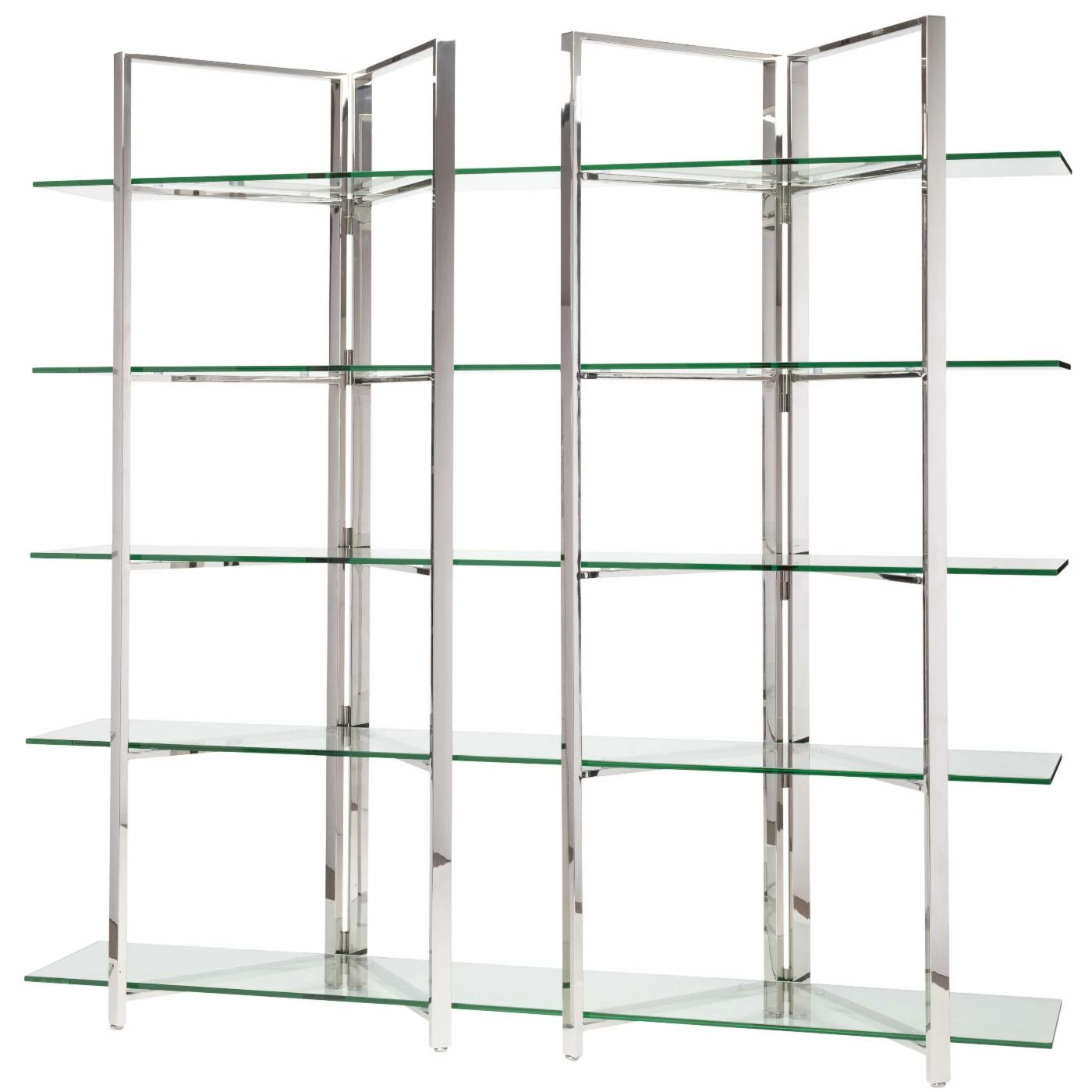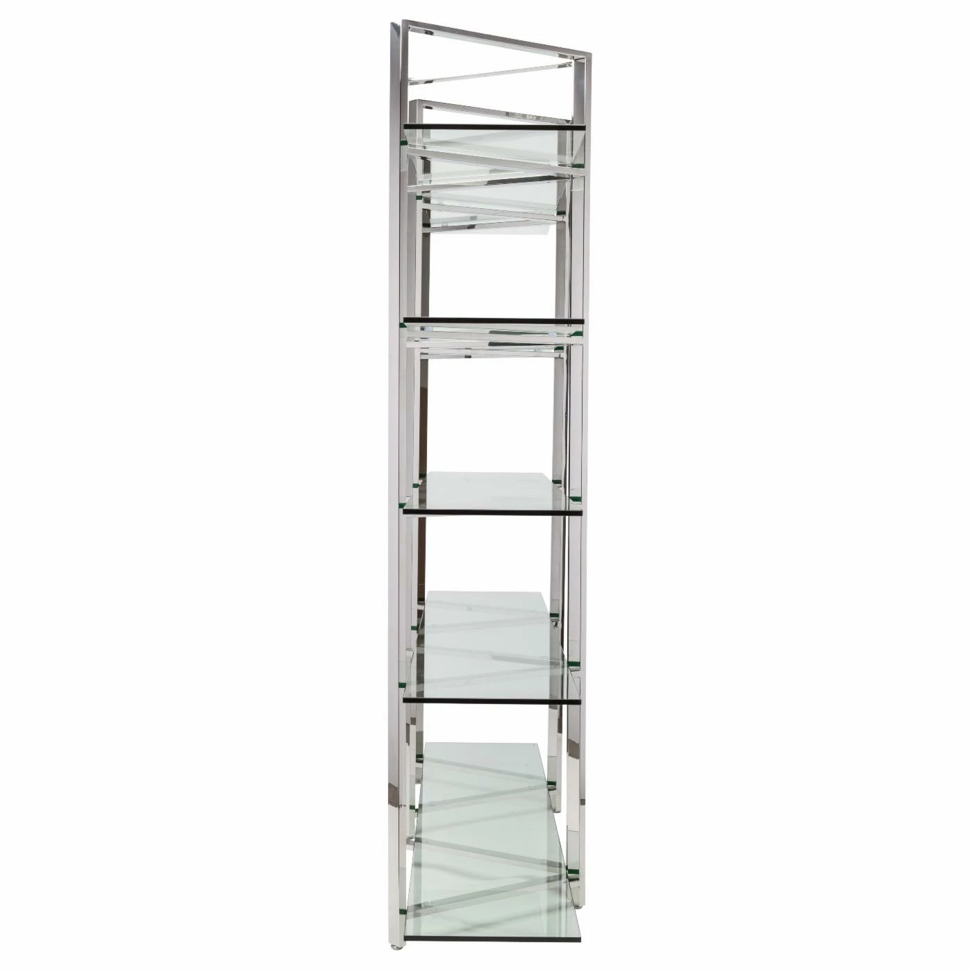 The Nuevo Elton Book Shelf has a large, robust frame, and even in spite of it’s sturdy construction, it maintains a remarkably light and open feeling. Each of the five shelves is made from a half-inch-thick of clear, tempered glass. The two-part frame of the shelf is made from hinged rectangles of polished stainless steel that are offered in a range of finishes. The reflective quality of the steel helps to give it a lighter, mirrored feel. The design goes together easily, and the Elton Book Shelf is sturdy enough that you could fill it with books or just add a few tastefully chosen objects.