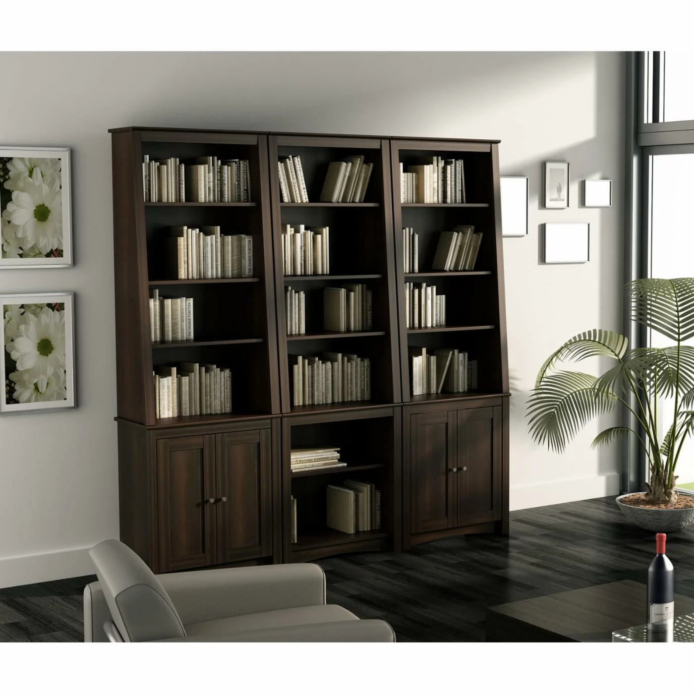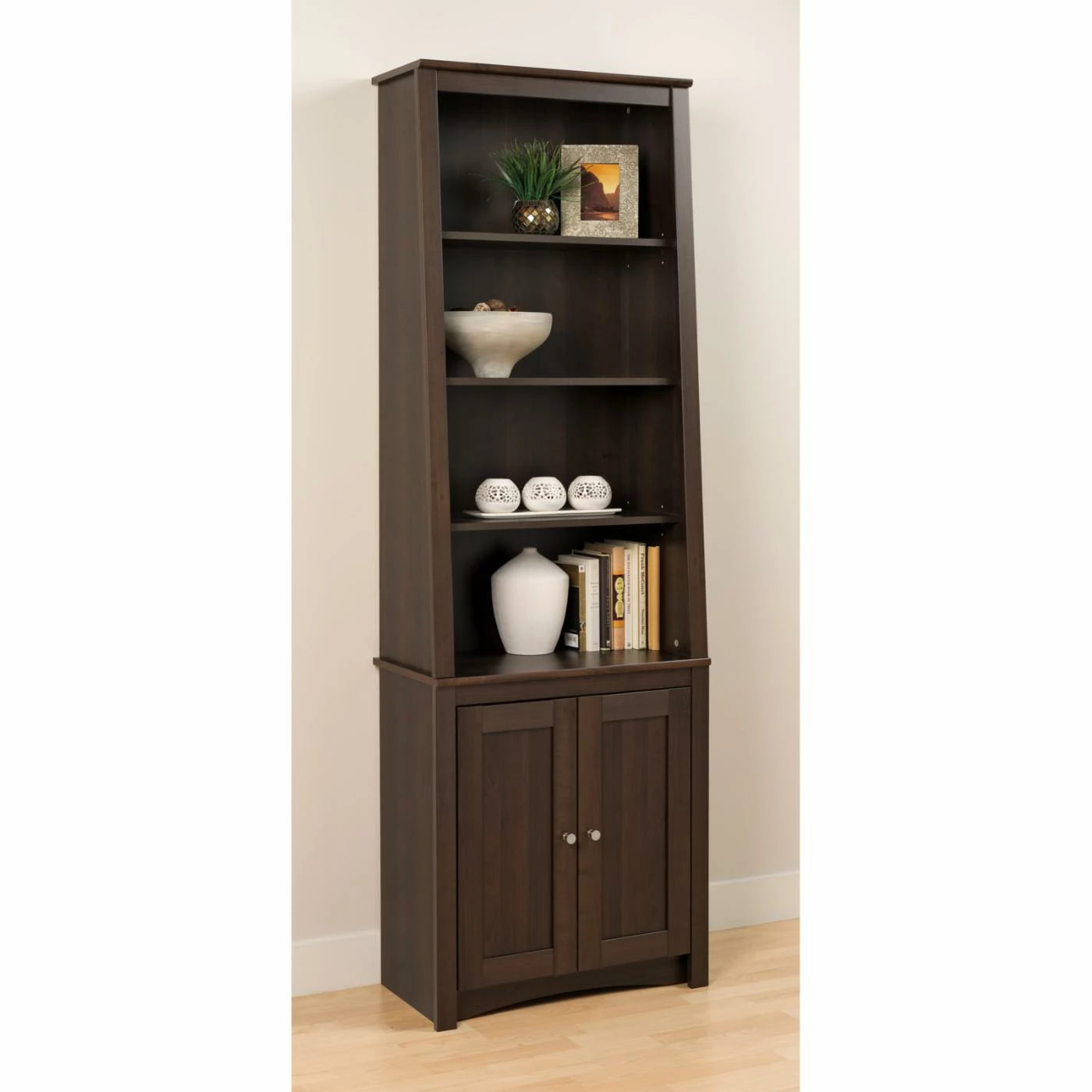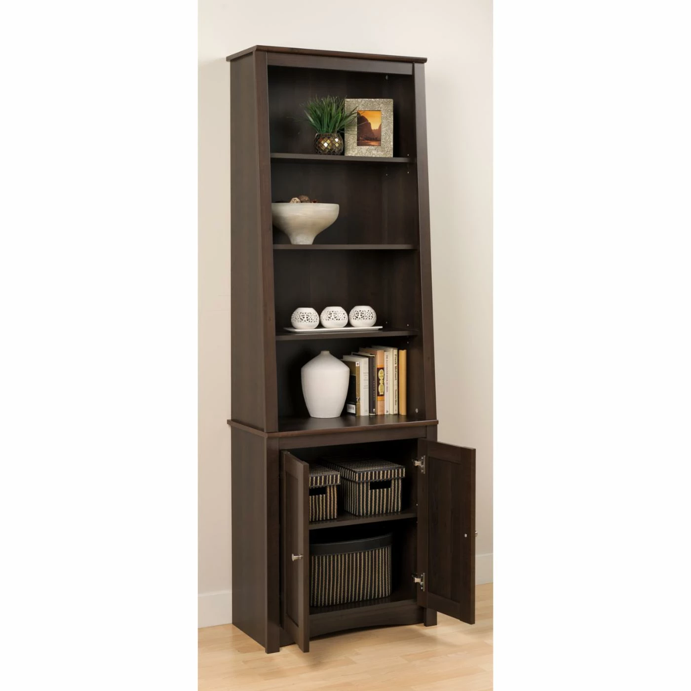 Create an impressive display with the Prepac Tall Slant-Back Bookcase – Espresso with 2 Shaker Doors. Four shelves rise high above the base, which has two cabinet doors for concealed storage. The cabinet area includes one adjustable shelves. A rich espresso brown laminate finish creates a dignified impression. Shelves are crafted of durable, environmentally friendly engineered wood.