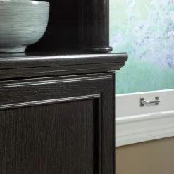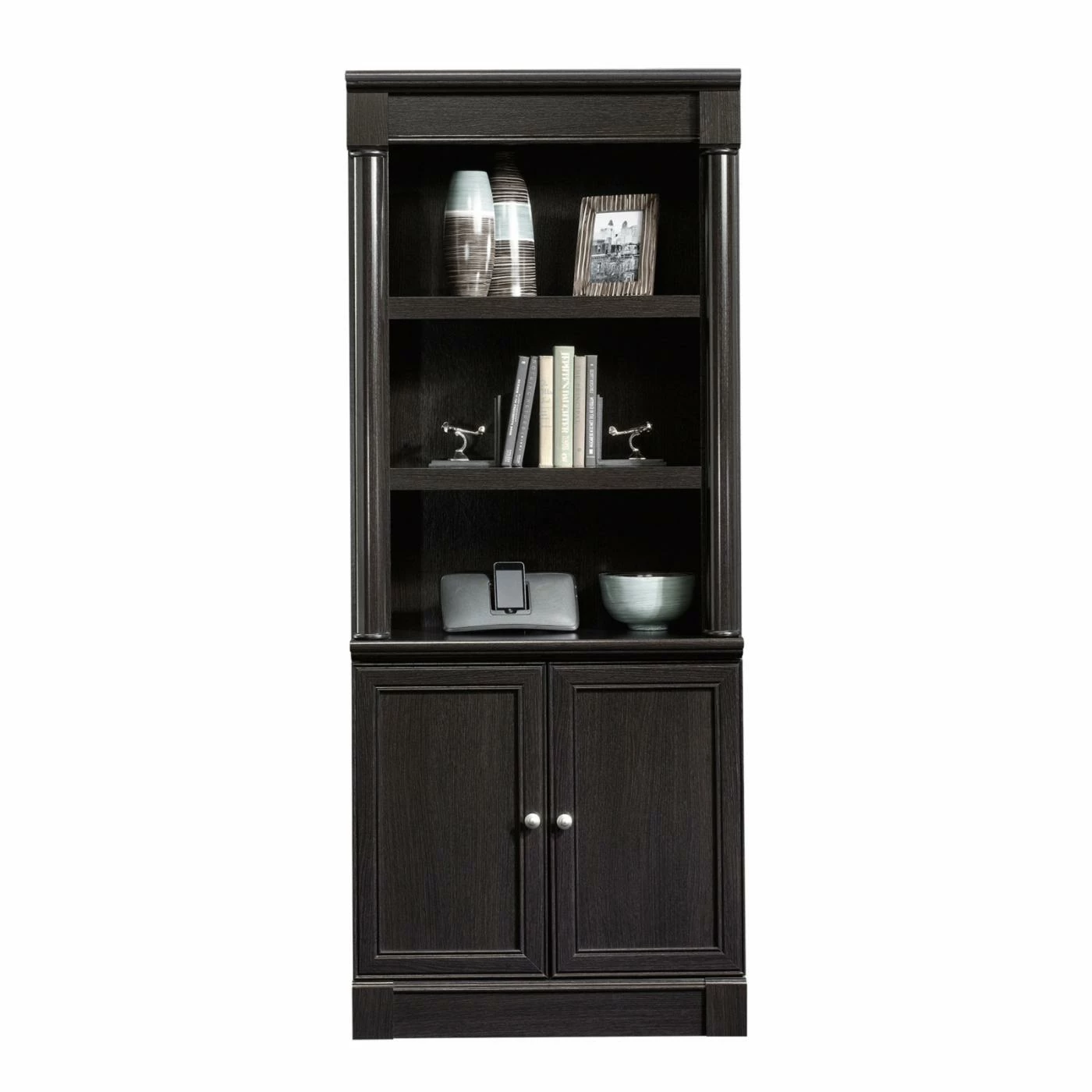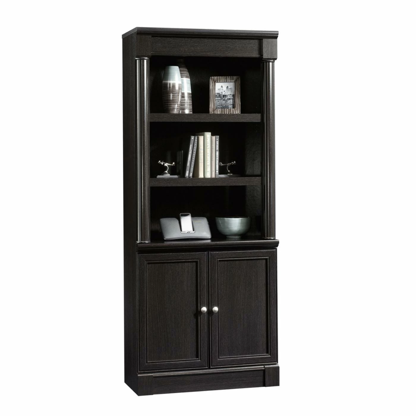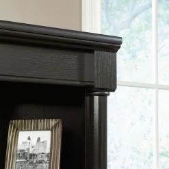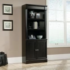 Three adjustable shelves sit atop a cabinet space with the Sauder Palladia Library Bookcase with Doors – Wind Oak for the ultimate combination of open and concealed storage. Sleek, rounded pilasters flank the sides of this unit and sit atop squared-off plinth bases, lending an unmatched sophistication. The enclosed back panel offers cord access. You’ll breeze through assembly thanks to patented slide-on moldings. Made in the USA.