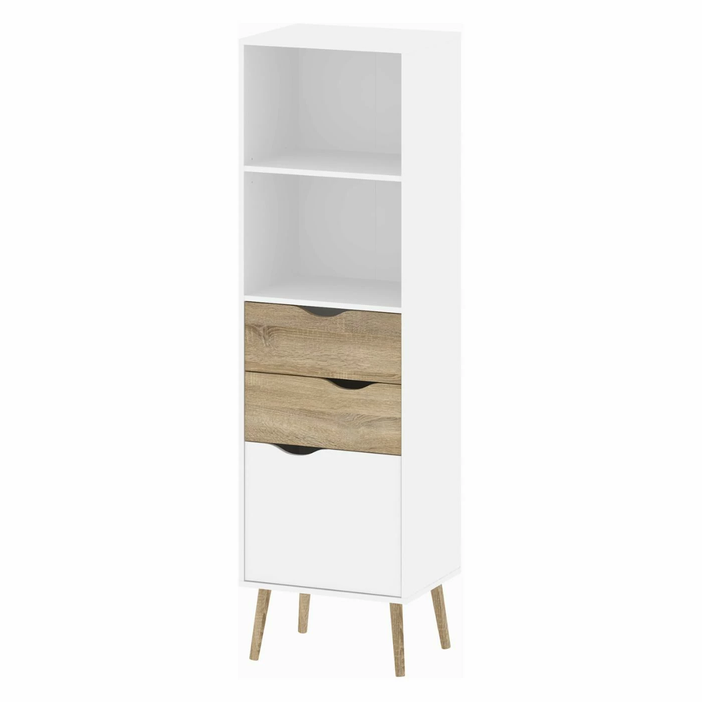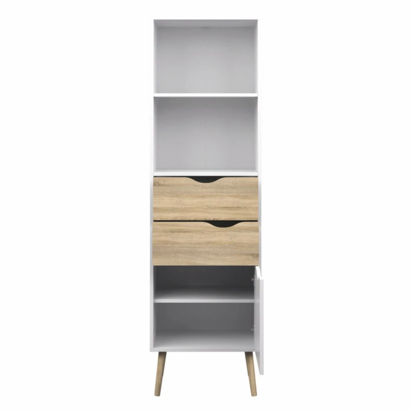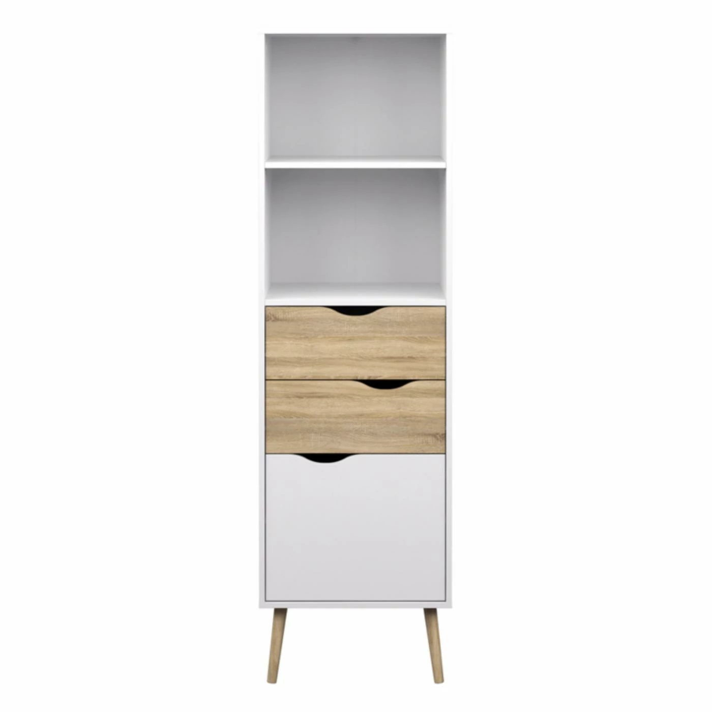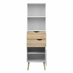 Store in style with the retro modern charm of the Tvilum Delta 2 Drawer Bookcase. This uniquely designed bookcase is crafted from sustainable wood and features two shelves, a large cabinet door, and two center drawers with cutout handles. It contemporary look is enhanced with a crisp white finish and natural oak accents. Made in Denmark.