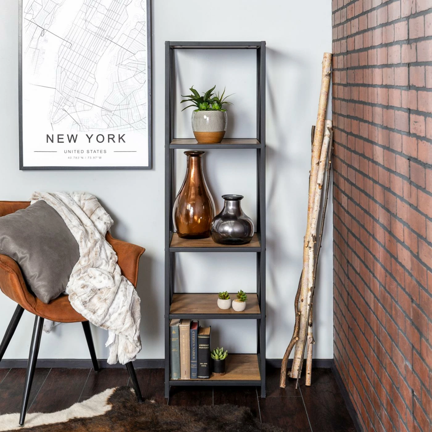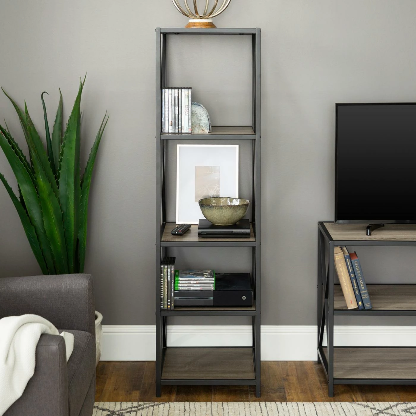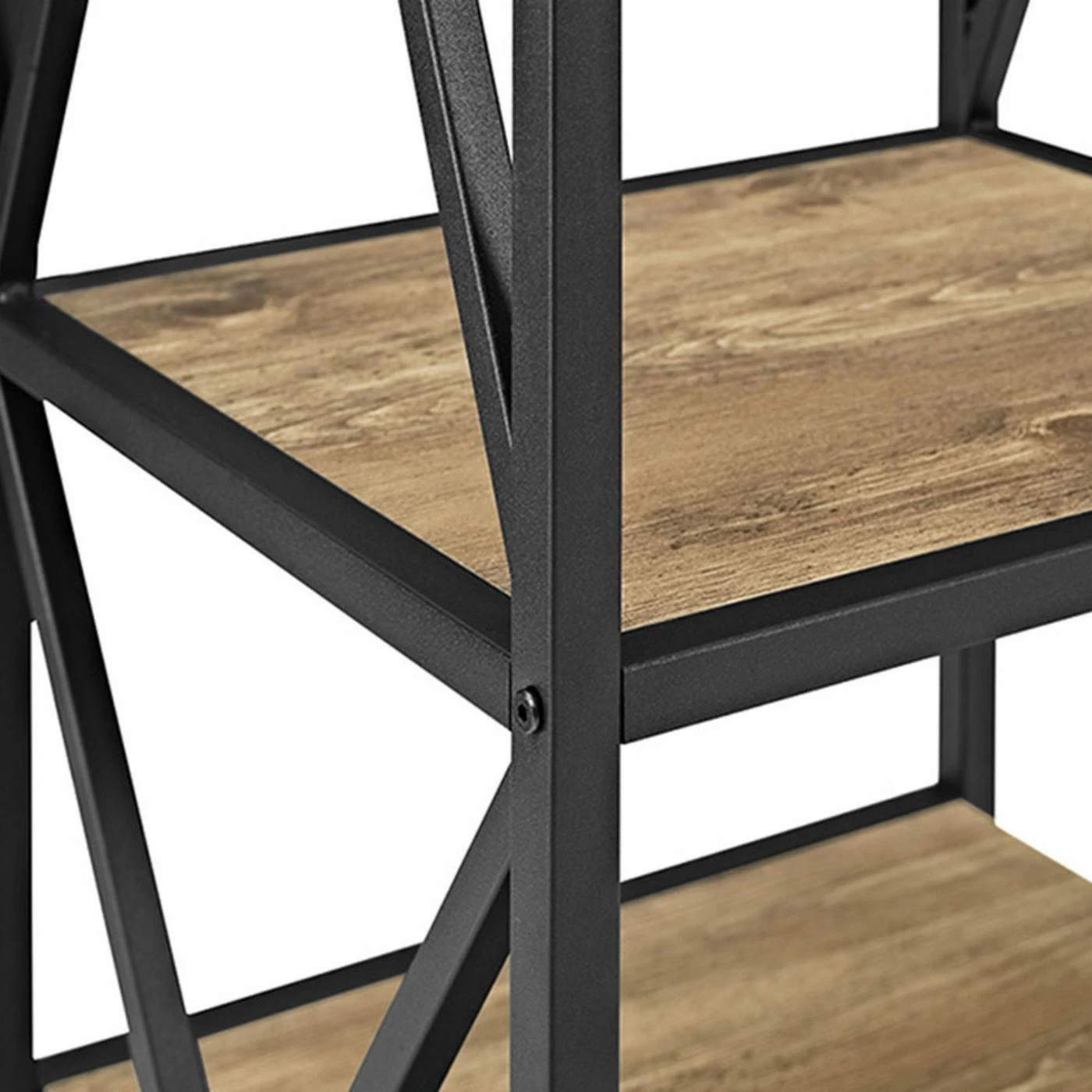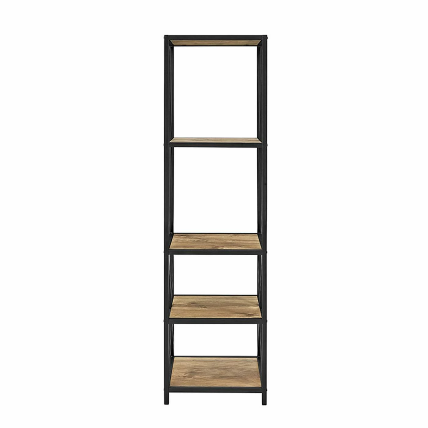 Whether you’re storing books, pictures, vases, decorative baskets, or tiny knickknacks, they’re sure to display well on the Walker Edison 61 in. Tall X-Frame Media Bookshelf. This powder-coated metal and MDF bookshelf features an open X-frame design that frames your belongings just right for viewing. Four shelves provide ample space and come in your choice of available finishes to suit your style. Ships ready to assemble.