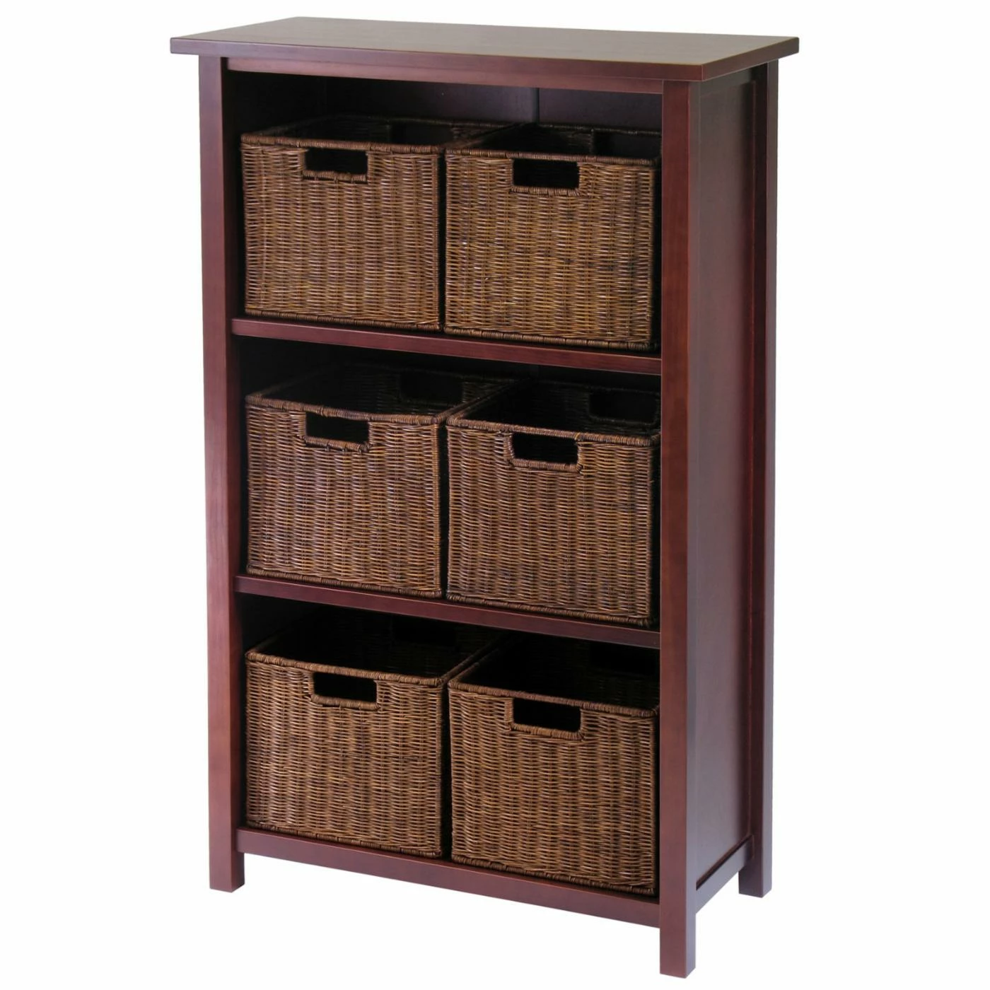 Elegant form meets superb function in the Alaynia 3-Shelf Bookcase With 6 Small Baskets 7-Piece Set. This beech-wood bookcase has a warm antique walnut finish and three large shelves that hold six sturdy wired rattan baskets. Use this set in the home or office to keep rooms clutter-free for lovely organization. Each basket is beautifully crafted of sturdy wired rattan in lush walnut finish, and handles give you a firm grip to take these baskets wherever you go. Bookcase dimensions: 28W x 13D x 43H inches. Basket dimensions (each): 11L x 10W x 9.5H inches.