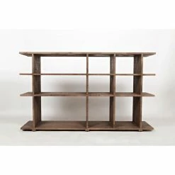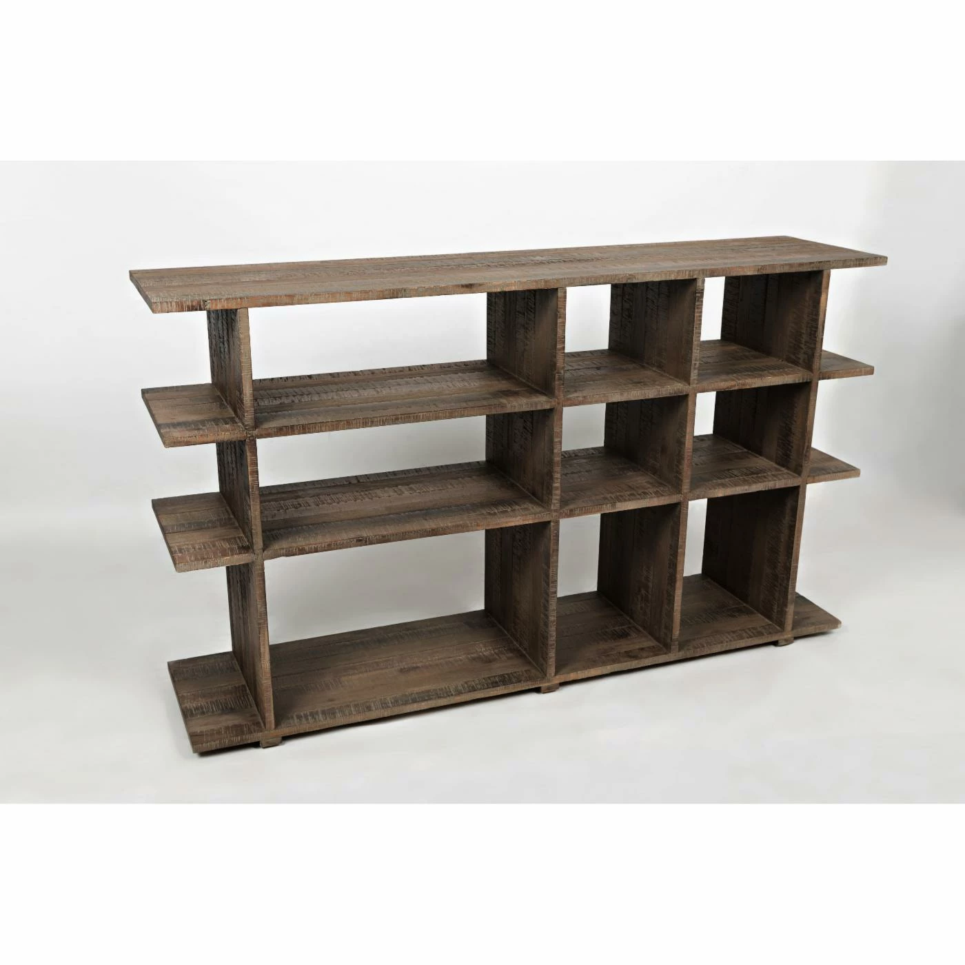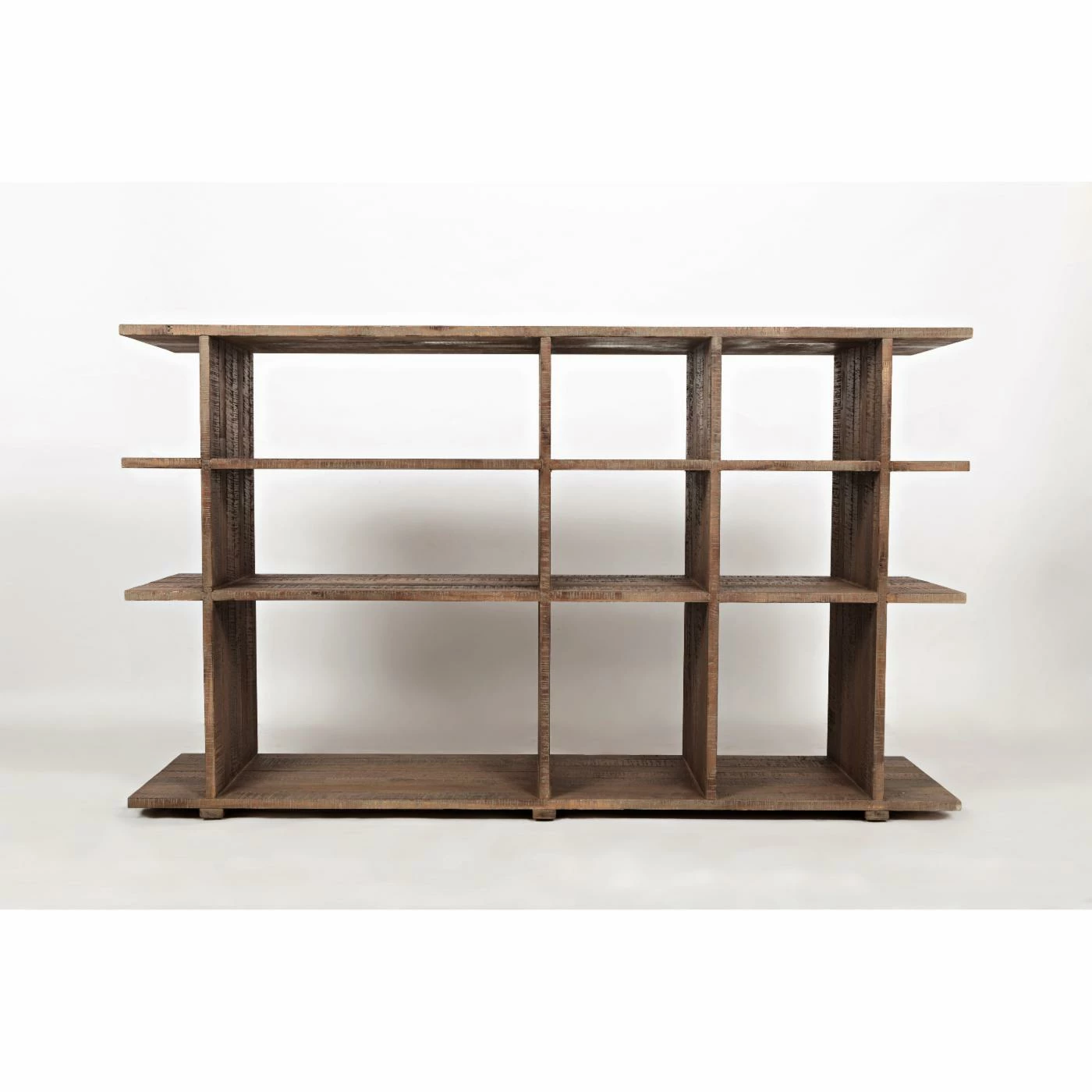 The Jofran Conundrum Bookcase provides your bedroom or living room with a tremendously versatile space for display, storage, and organization. This wide bookcase features a rectangular top for arranging bookends, photos, and other decorative pieces. The core of the piece is divided into a number of open, cubic shelves with open-sided shelves on either end. Solid acacia wood constructs the frame, which is topped by a natural finish with a wire-brushed distressed look.