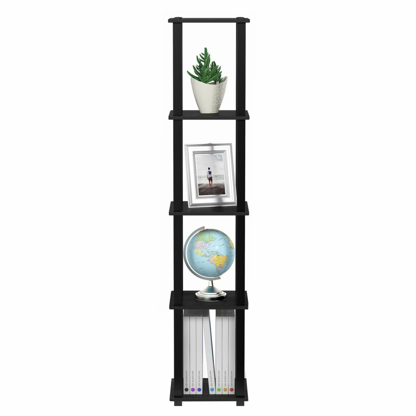 Widen your storage space with the narrow Furinno Turn-S-Tube 5-Tier Corner Bookcase. Perfect for small spaces, this slim shelving unit puts modern-minimal lines to multifunctional use. The frame is durably crafted with engineered wood and structural PVC supports, all finished in a chic black. Five open shelves can hold books, frames, collectibles, and more. Assembly is easy and tool-free; simply turn and twist the structural tubing.
