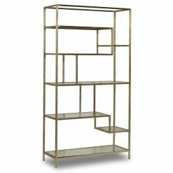A simple and streamlined place to proudly display your favorite artwork, pictures, and more, the Hooker ΓtagΓ¨re makes a sensational centerpiece for your living room or dining room. Its charming frame is built from squared iron with horizontal and vertical bracing bars. The metal is finished in beautiful silver leaf color. A series of glass shelves are built into the design, spaced at different heights and different lengths that let you match the right surface to your individual pieces. Its open look and contemporary construction makes this an ideal addition to any modern decor.