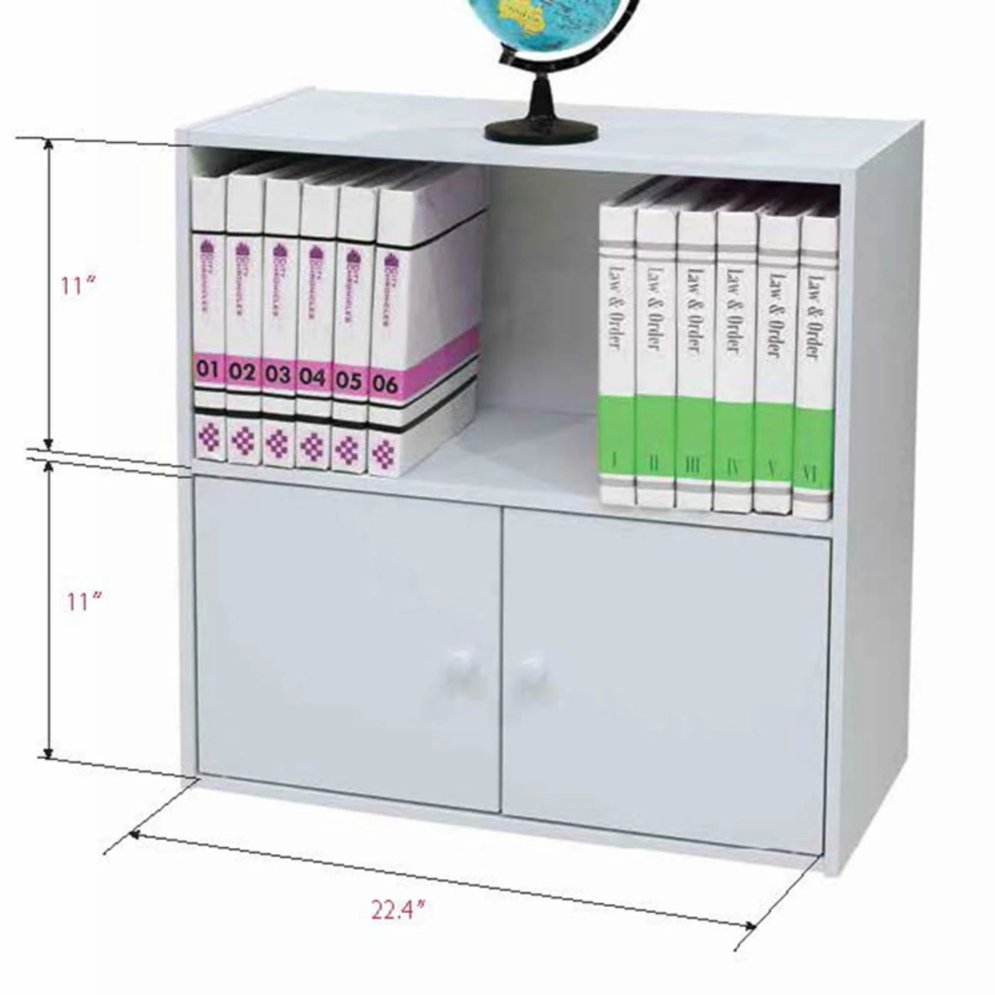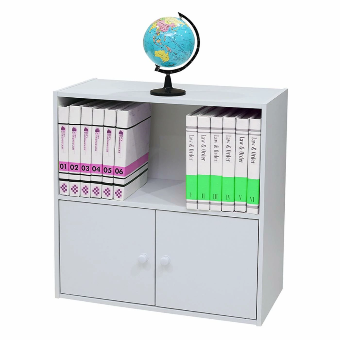 Perfect for a home office, the K&B Furniture White Wood 2 Door Bookcase with Shelf offers a generous open shelf and enclosed storage. This white laminate bookcase is easy to clean and durable. The cupboard doors open to reveal abundant storage inside.