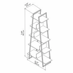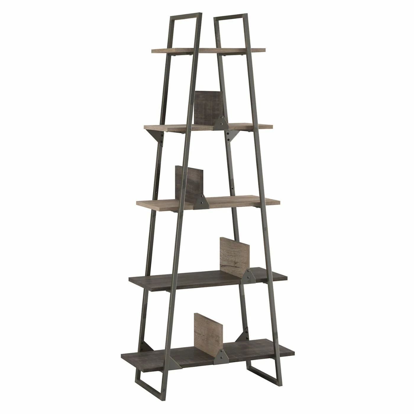 Add a rustic, industrial flair to your home or office with the Bush Furniture Refinery A Frame Leaning Bookshelf – Rustic Gray. This bookcase has an A-shaped frame made from squared metal and finished in industrial gray. Five shelves offer plentiful organizational space with an open back and sides. The shelves are finished in a charred wood color and come with adjustable plastic dividers.