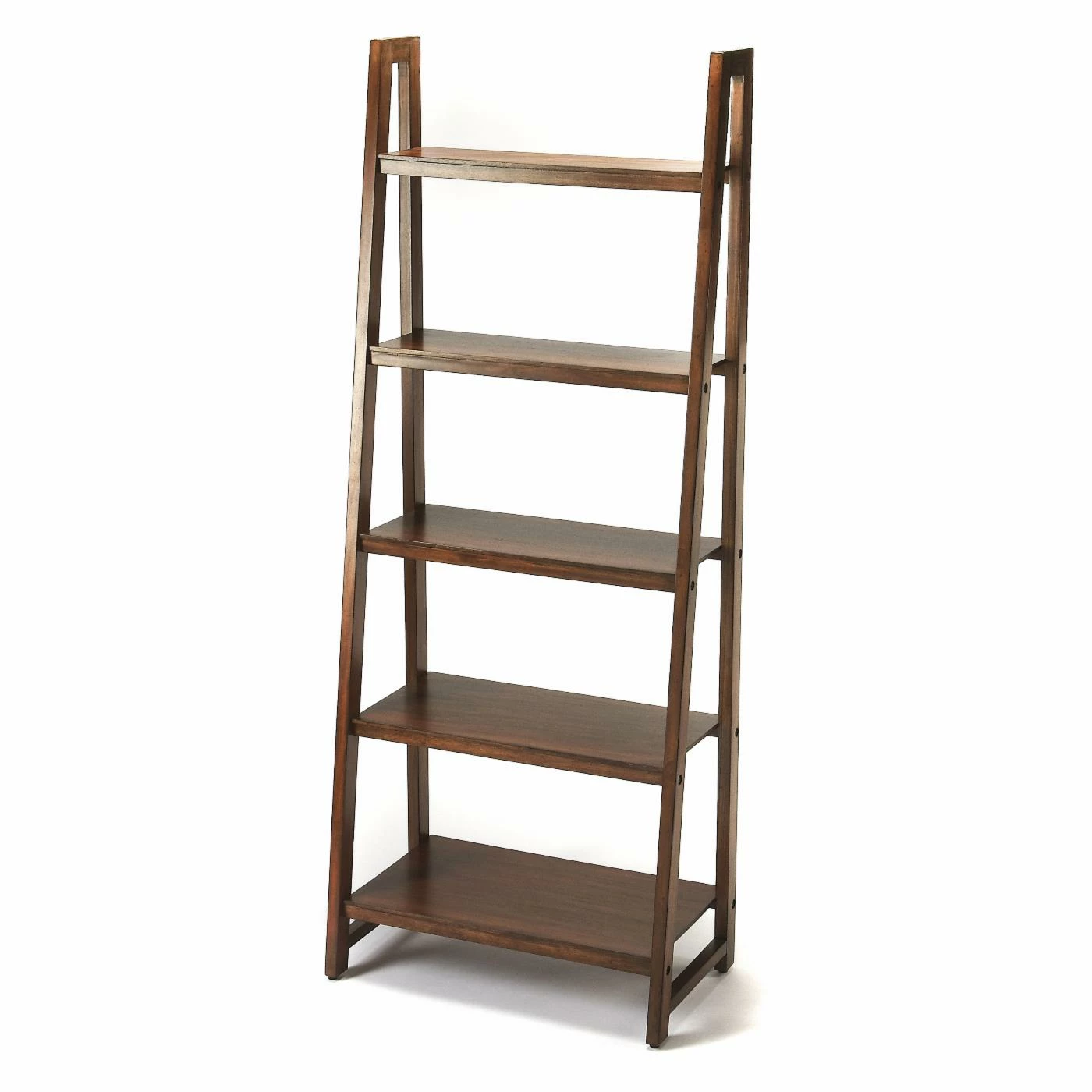 The ladder-style design of the Butler Specialty Stallings 5-Shelf Ladder Bookcase is a fashionable fit in home offices, living rooms, and more. The bookcase is crafted of mahogany wood solids and veneers with engineered wood (MDF), and it’s available in a choice of finish. Use the five slanted shelves to store books and essentials or display favorite home accents.