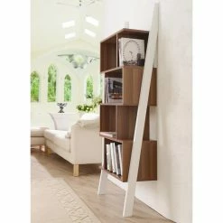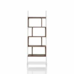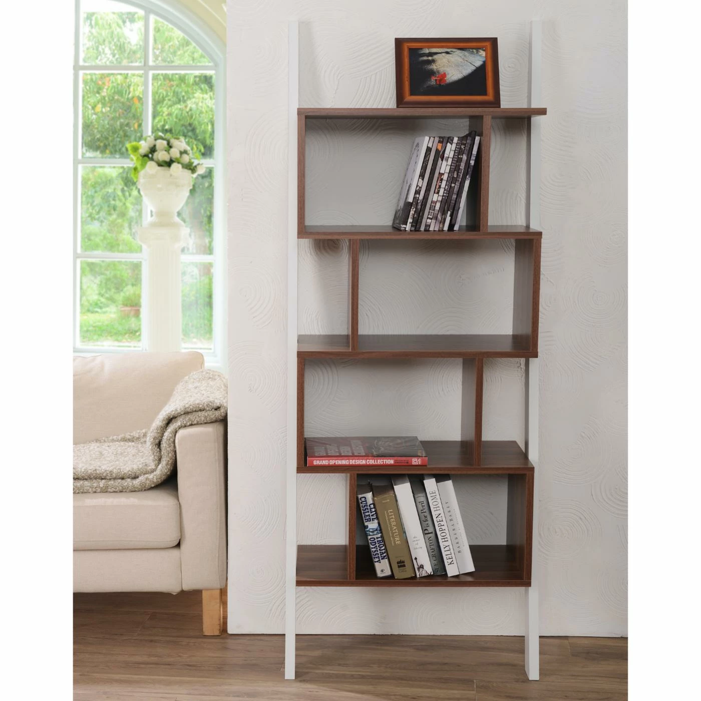 The HN Home Becket Mid-Century Modern White and Walnut Contemporary 5-Shelf Display Stand is a totally unique way to display photos, books, and more in true modern style. This two-toned shelf has white angled legs that rest against the wall and support a row of brown walnut boxes in an alternating pattern for a truly fun design you can add to any room.