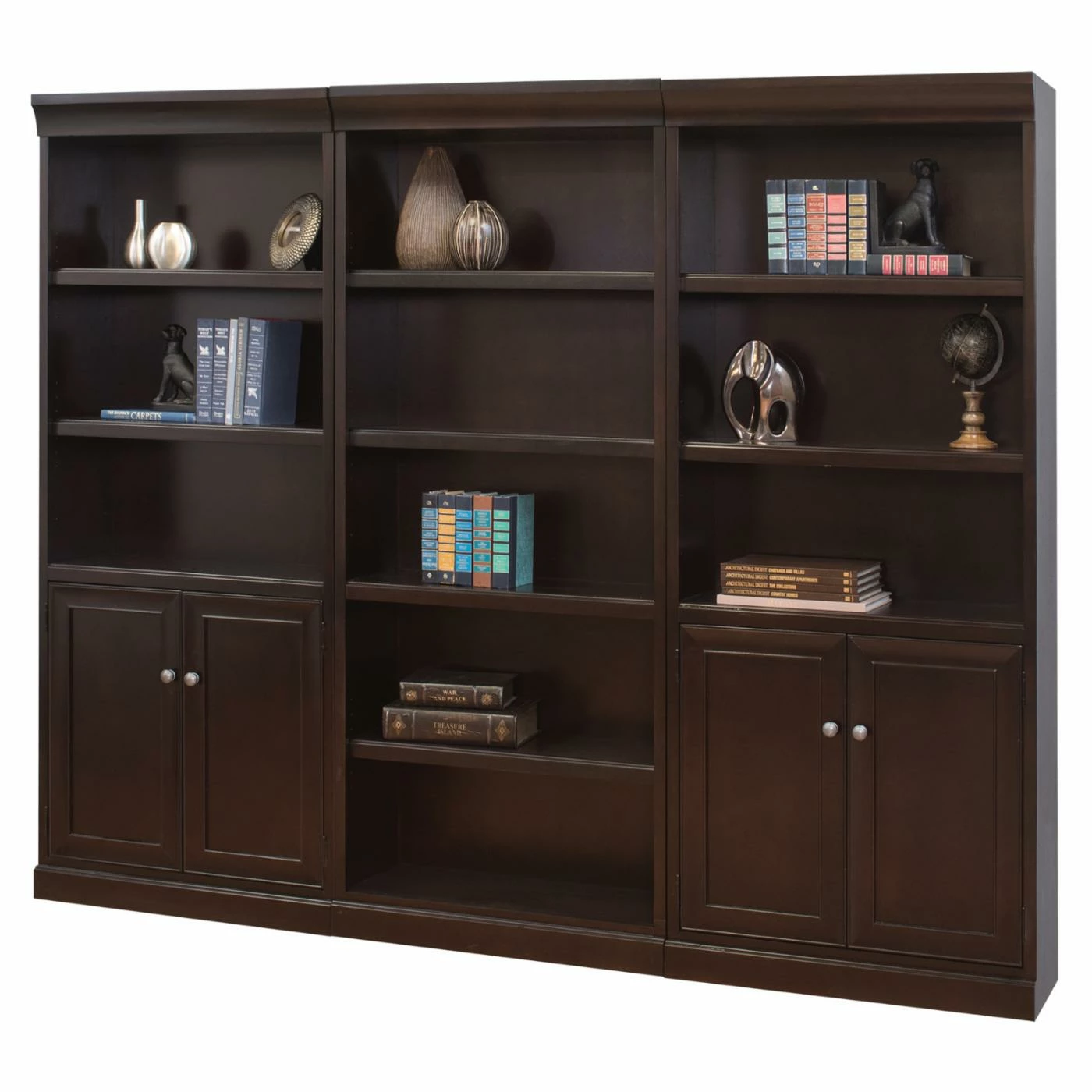 Eloquent espresso finishing makes the Martin Furniture Fulton 90 in. Wood Wall Bookcase with 4 Doors – Espresso a bookcase that adds depth and gravity to your space, visually anchoring the room while providing plenty of storage for your books and display items. Most shelves are adjustable to accommodate items of differing sizes and create a display that’s uniquely your own. Four cabinet doors on the ground floor allow you to stash away necessities. Solid wood construction offers longevity, while carefully selected veneers add natural wood grain beauty.