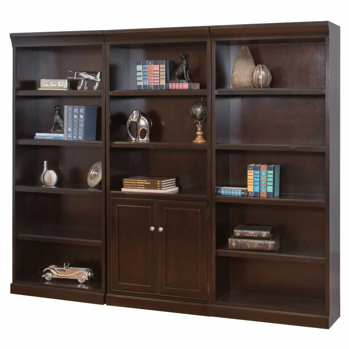 Create a feeling of home with the Martin Furniture Fulton 90 in. Wood Wall Bookcase with Doors โ Espresso. This whole-wall bookcase is finely finished to keep pace with today’s brand of tradition. Concealed storage space behind cabinet doors on the lower level is ideal for helping the younger set have a place for everything, so everything can be in its place. And with plenty of adjustable shelves, you can make use of vertical space to store more while conserving square footage. The rich espresso finish complements the carefully chosen veneers to highlight natural wood grain patterns. Solid wood construction offers dependable quality for the future.