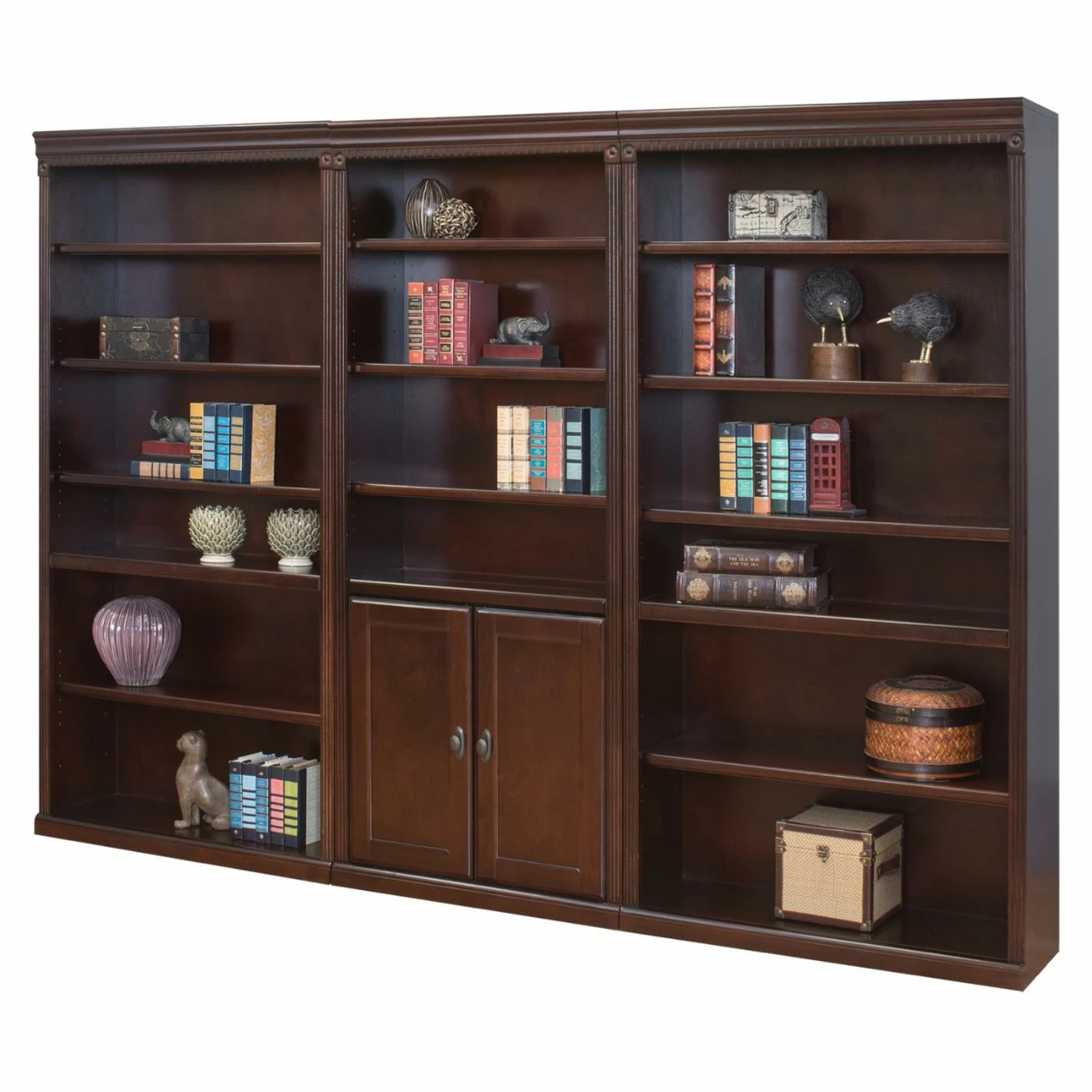 Give yourself room. The Martin Furniture Huntington Club 102 in. Wood Wall Bookcase with Doors – Cherry takes vertical storage to new heights of refinement and distinction, creating a visual anchor for the room that can stand in for or balance a fireplace. Solid wood is treated to the finest available veneers, which are bathed in a hand-rubbed cherry finish to create a warm, classic impression. On the lower level, cabinet doors can conceal essential office supplies and more. Dentil moldings and fluted columns show an appreciation for the age-old craft of fine woodworking.
