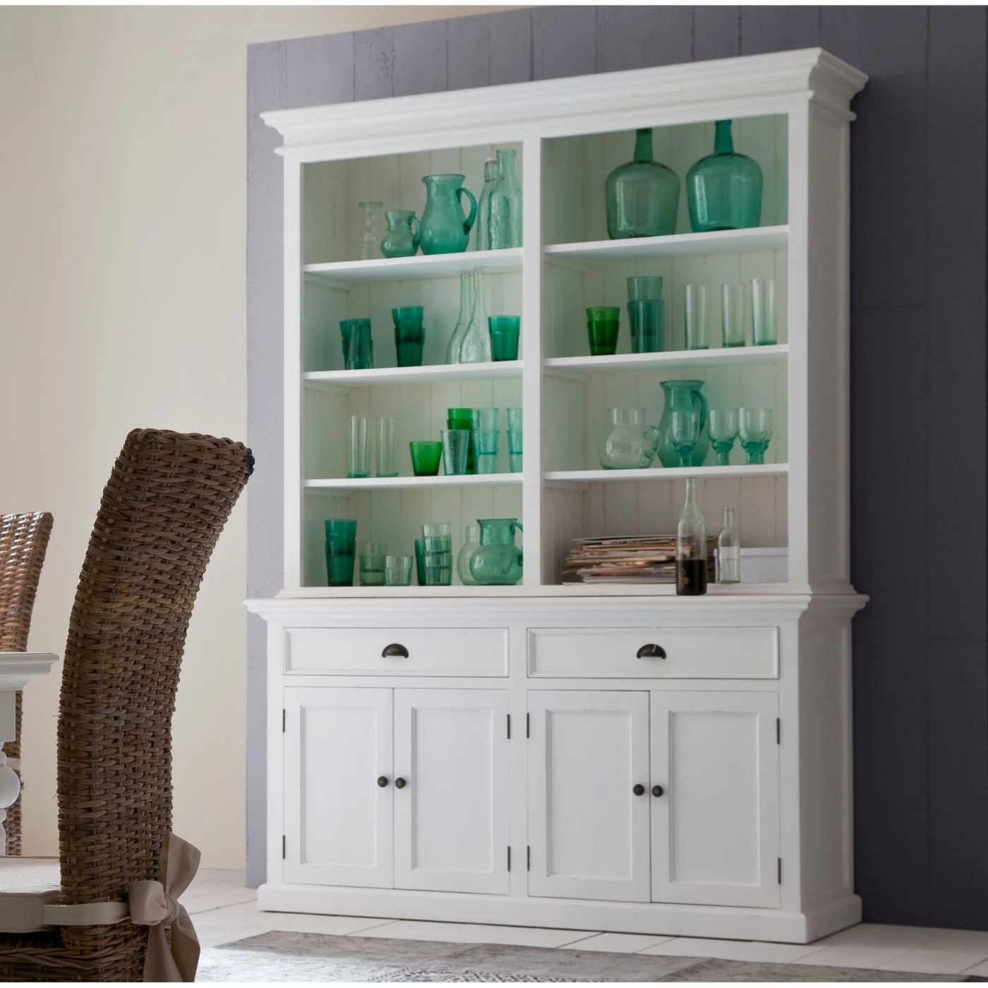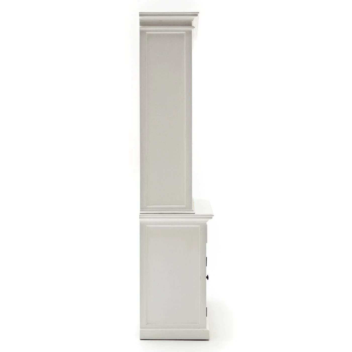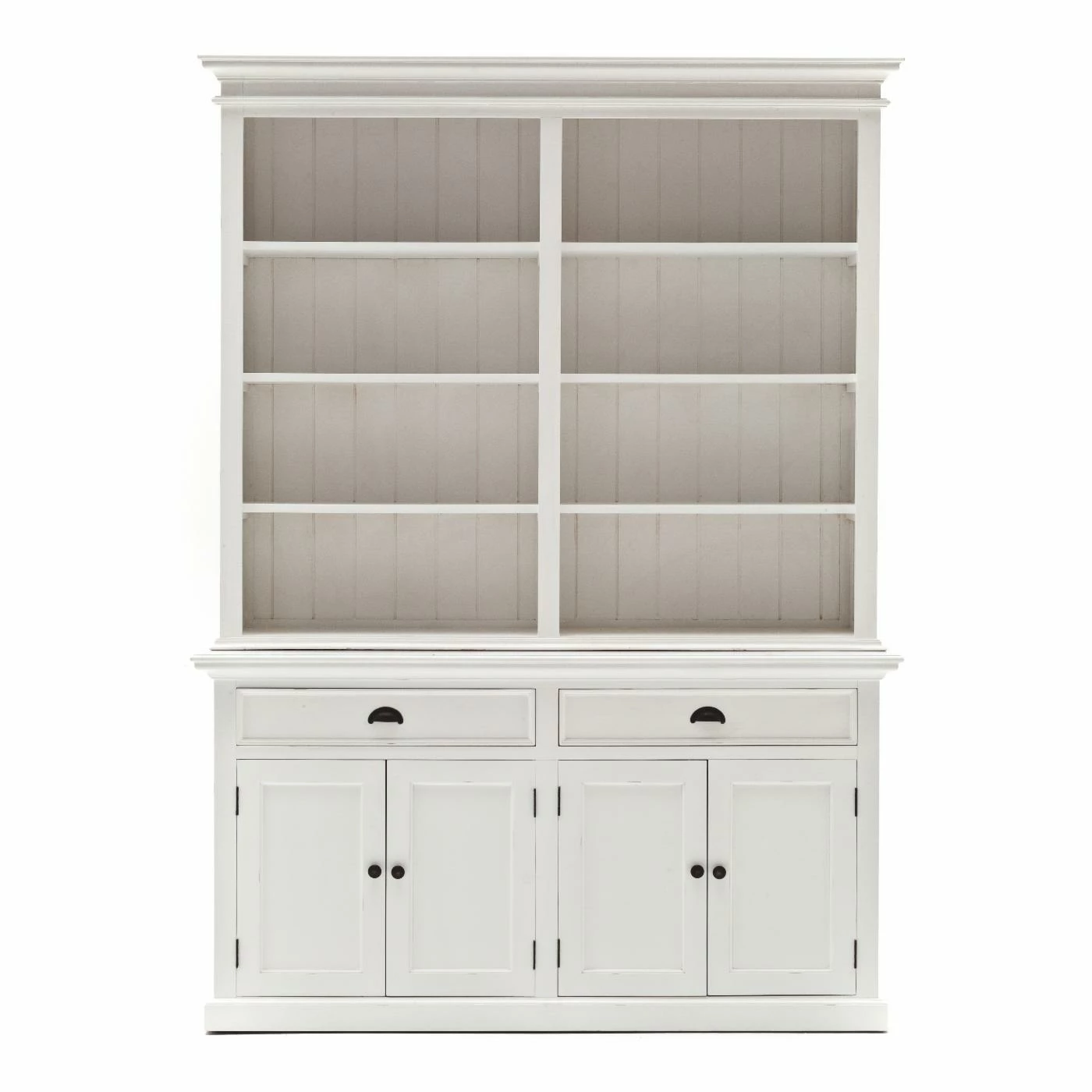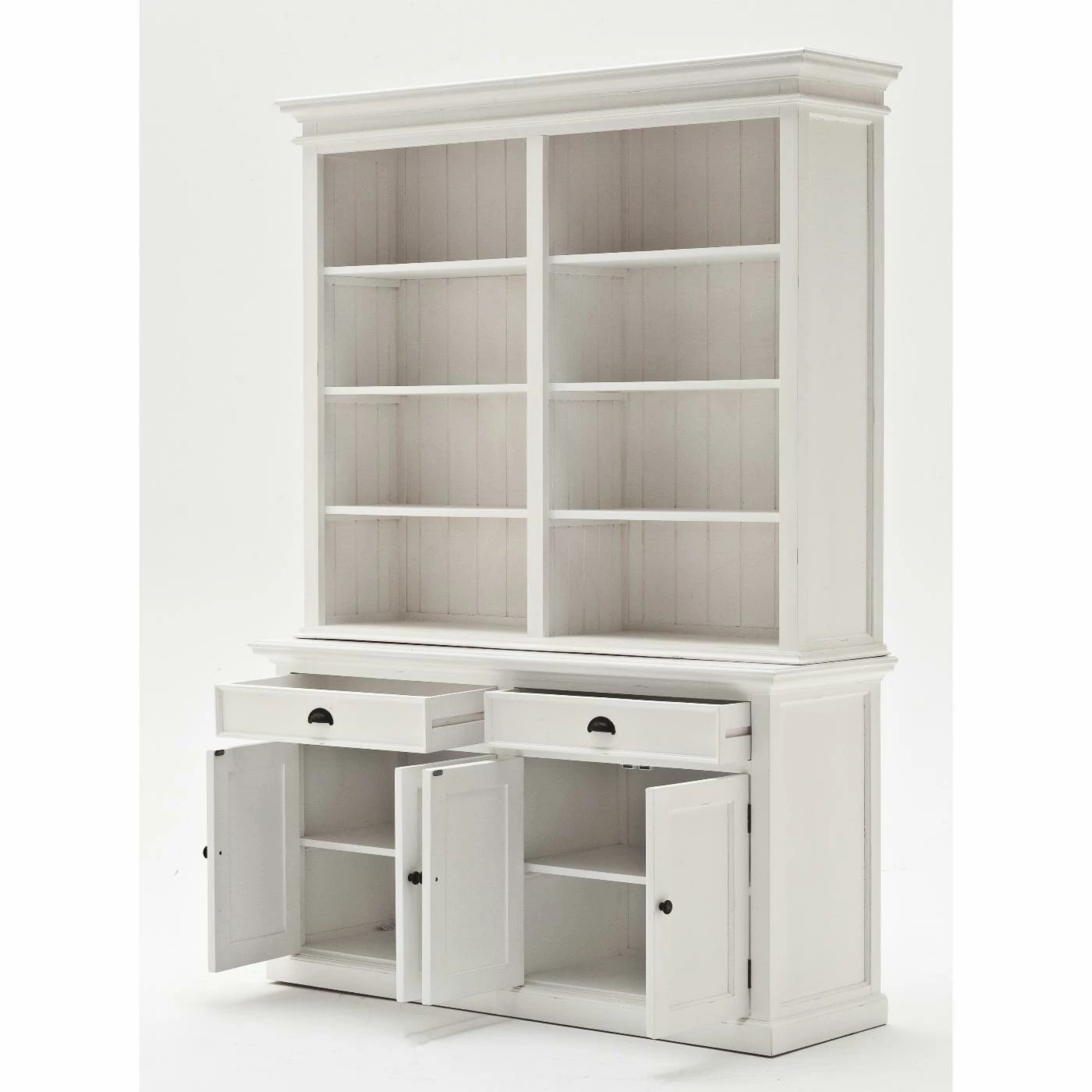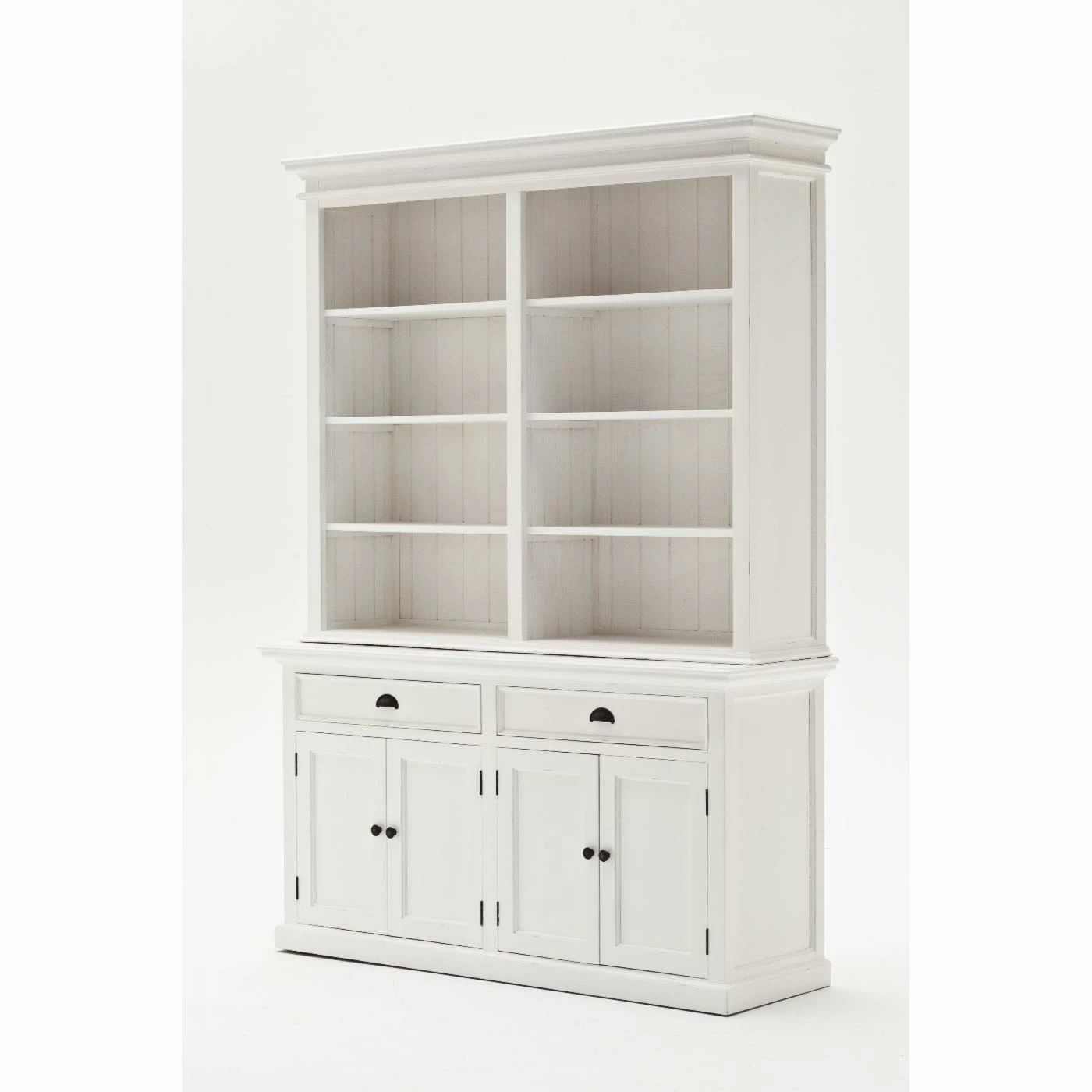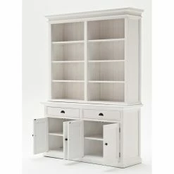 Create a look of simple elegance with the Nova Solor Halifax Hutch Bookcase Unit. Combining the charm of the French countryside with the coastal style of the Eastern seaboard, this hutch gives you ample storage space for glasses, trinkets, games, and more. Hand assembled from solid, kiln-dried mahogany and MDF, the semi-gloss white finish features a light distressing which gives it a rustic touch. Six shelves are ideal for your favorite dishes and decorative items while the storage cabinet and drawers gives you space for those items you like to have close at hand but not out in the open. Detailed bead board wainscoting and shaker-style doors give this hutch a classic look that goes with almost any decor.