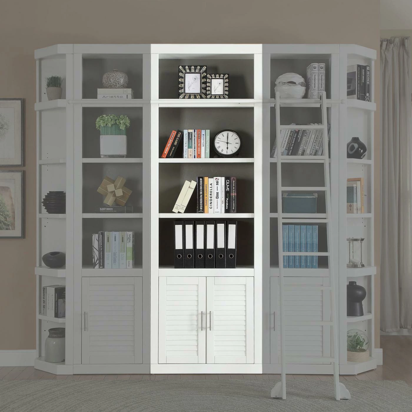 For a fresh breath of cottage style, use the Parker House Catalina 32 in. Open Top Bookcase in your office or living room. Twin louvered doors, sleek polished metal bar pulls, and a cottage white finish give this bookcase its contemporary cottage style. It offers fixed and adjustable shelving for customized display and works with the Catalina collection.