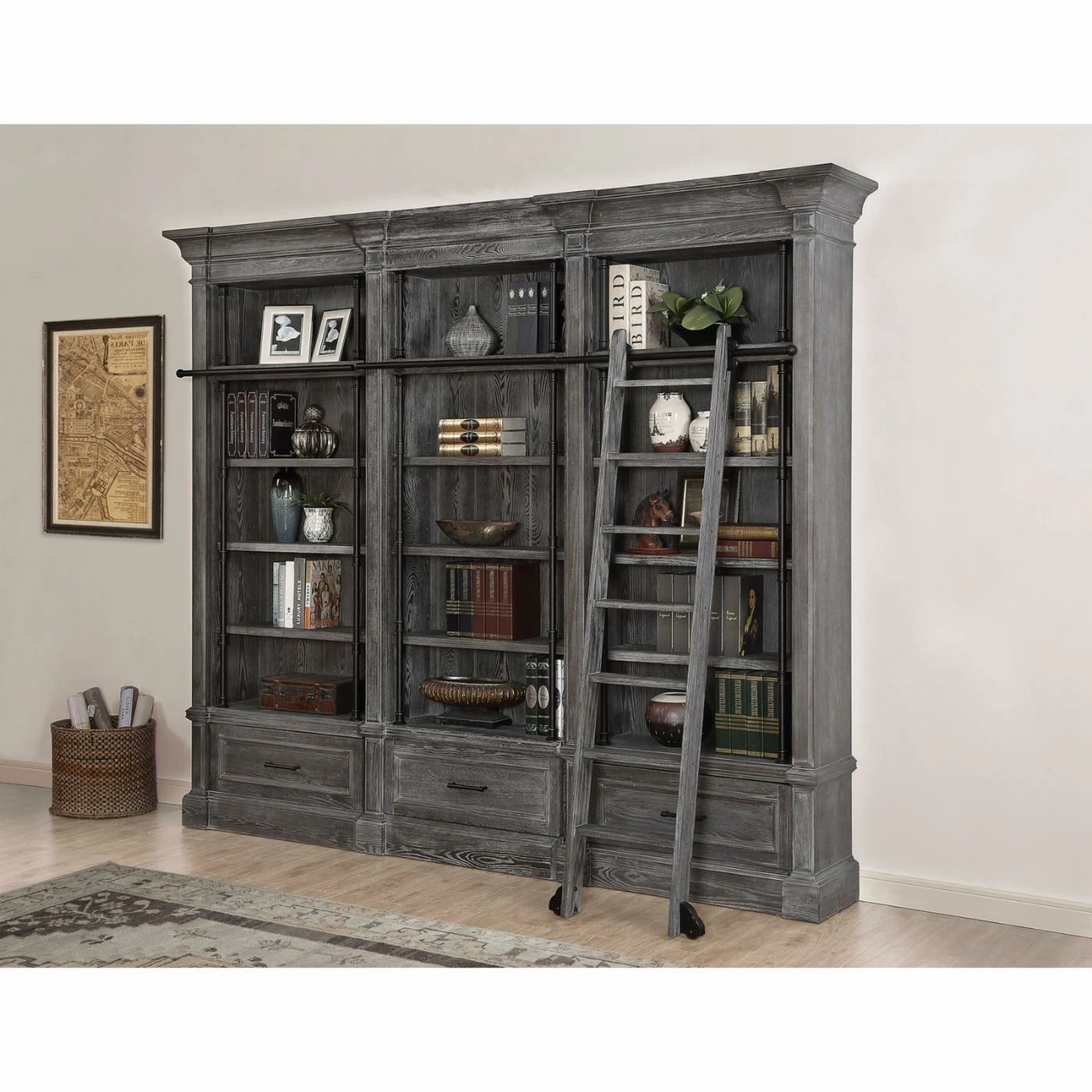 The Parker House Gramercy Park Library Bookcase offers everything you’ve always wanted in a library with a rustic industrial flair. Soaring crown molding, a shaped plinth base, and a burnished ash finish give the library wall its heritage appeal. Dark metal support rods and a ladder rail enhance the aesthetic. To offer enough storage to fit your favorites, each bookcase includes fixed and adjustable shelving, plus a lower drawer. To accommodate the scale of your library, this set is offered in size options.
