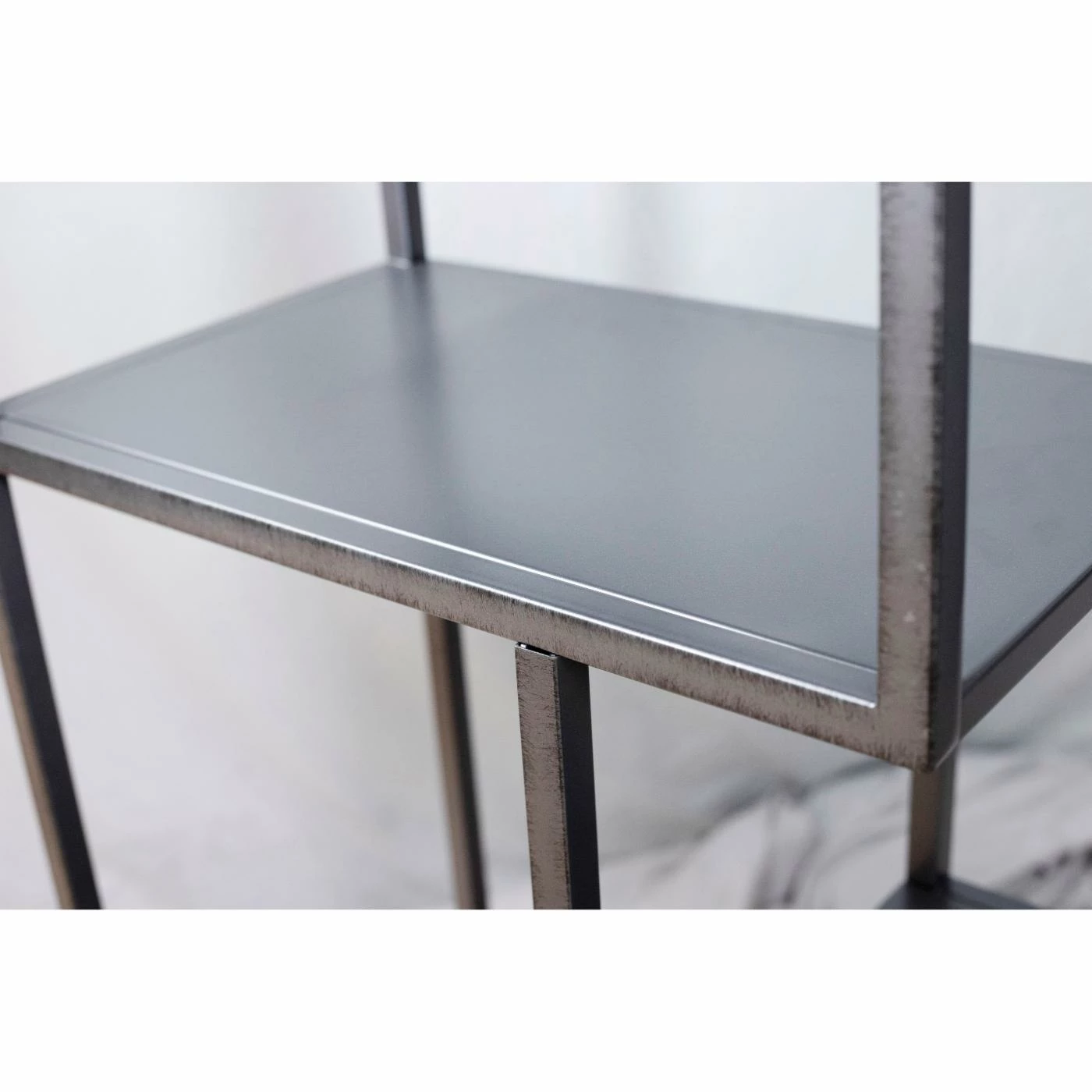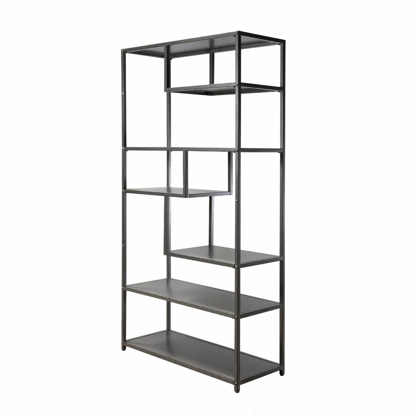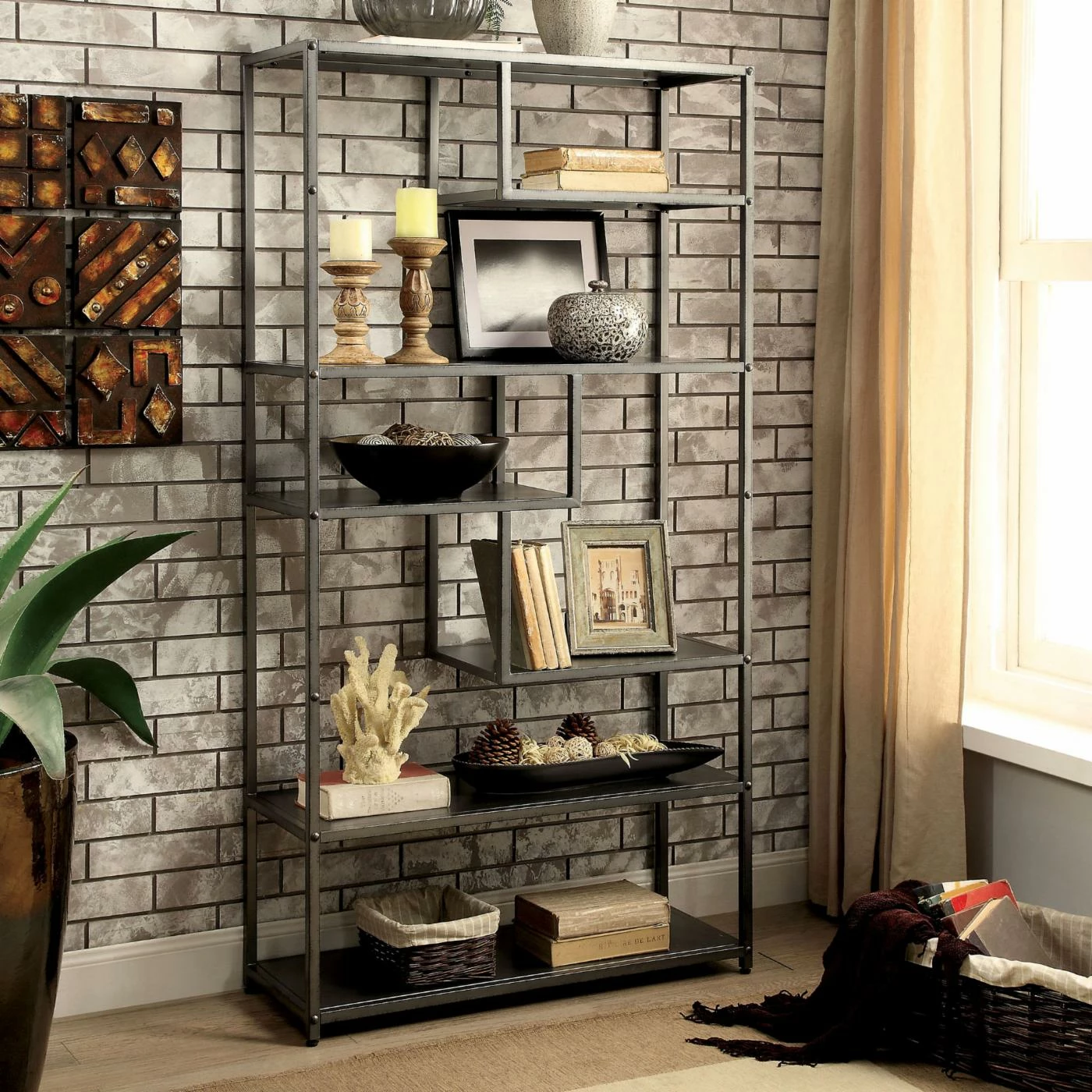 The Furniture of America Deysia Industrial Style Open Self Display Case features multi-sized shelving of replicated wood to display items of differing height and width. This display case is crafted of sleek, sturdy metal with a dark gray finish that’s ideal for industrial, transitional, and modern homes. The open-back and open-side design allows viewing of contents from multiple angles.