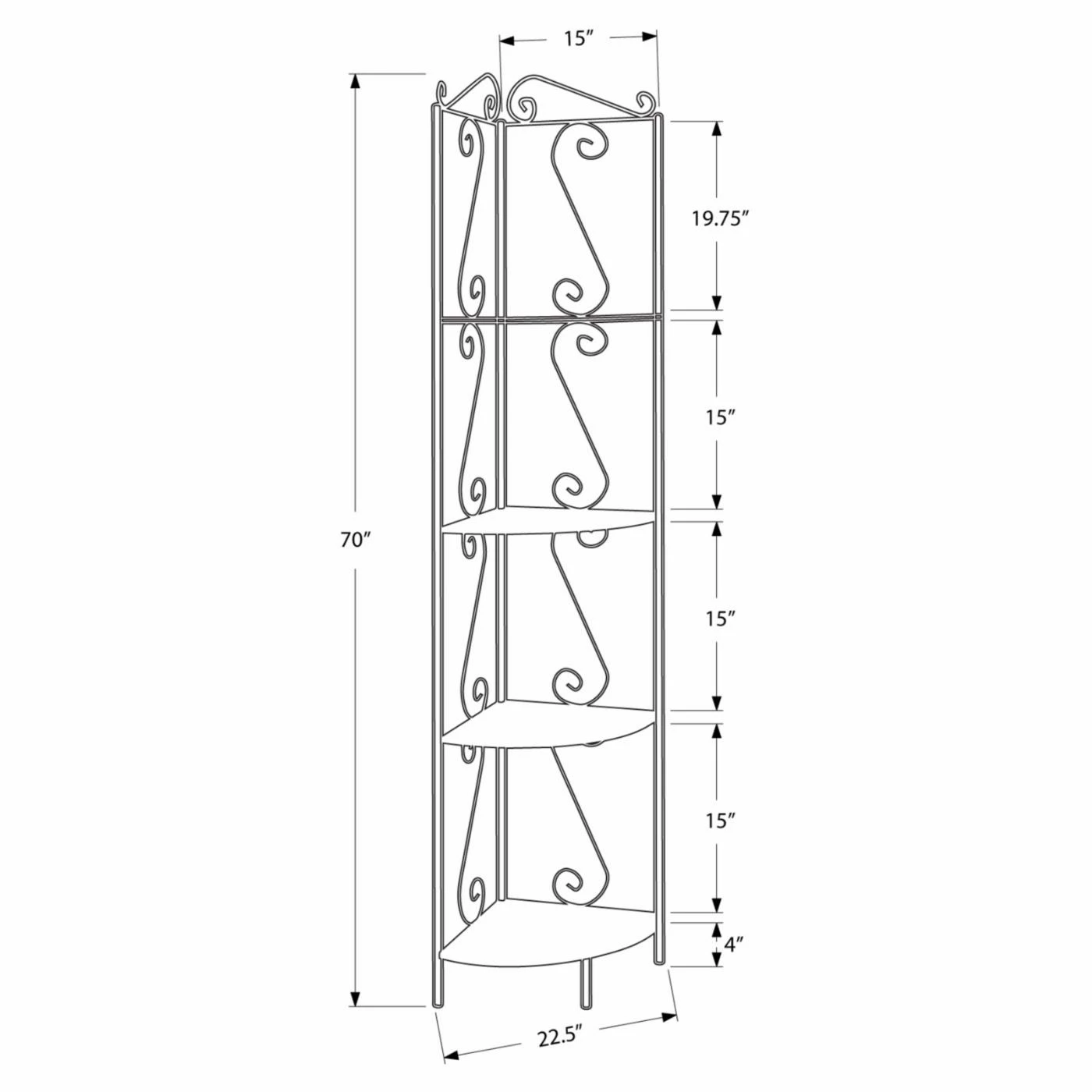Why is being put in the corner such a bad thing when every corner could be the next home for the Monarch Specialties Copper Metal Corner Etagere Bookcase? This elegant accent piece is an easy way to make a quick change to your space, with a lightweight body of metal tube and curling wire that spiral, twist, and flow to create a classic design. A coppery brown finish gives it the look of an antique, and four shelves offer you plenty of ways to add decor to your home.