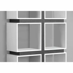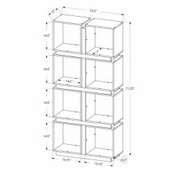 Art-deco lovers, rejoice. The Monarch 71 in. Bookcase is modern in style and high in function. This unique bookcase has an open back and is constructed of particle board and laminate in your choice of color. Eight symmetrical cubes line up to showcase books, magazines, vases, pictures frames, and your favorite decorative pieces. Its open-concept shelving allows it to function as a bookcase when push up against a wall, or a room divider either on its own or when doubled up and stood side by side. An instant conversation piece, this high-style bookcase instantly transforms any space to a contemporary wonder.