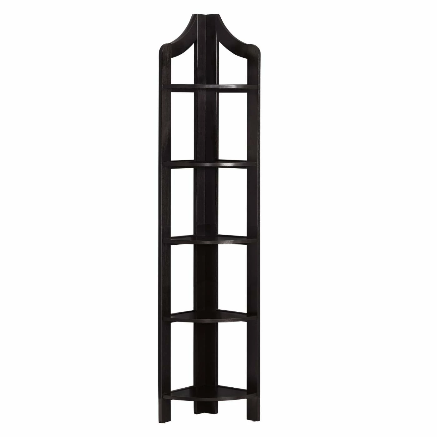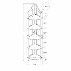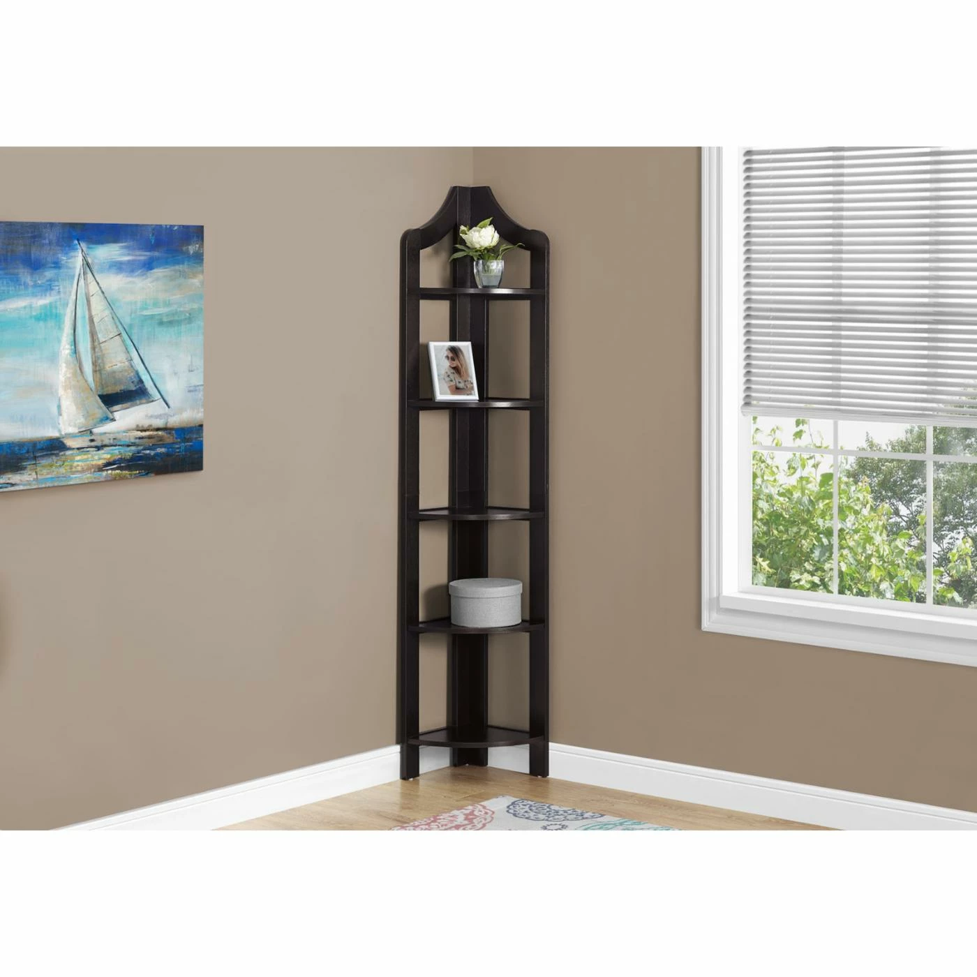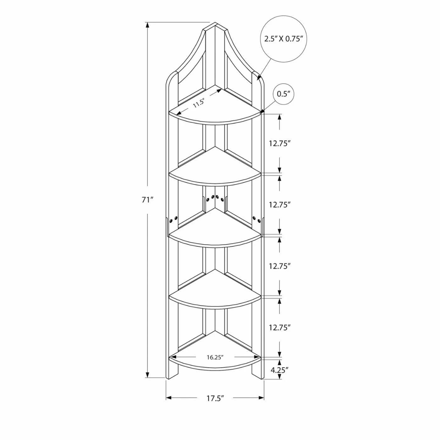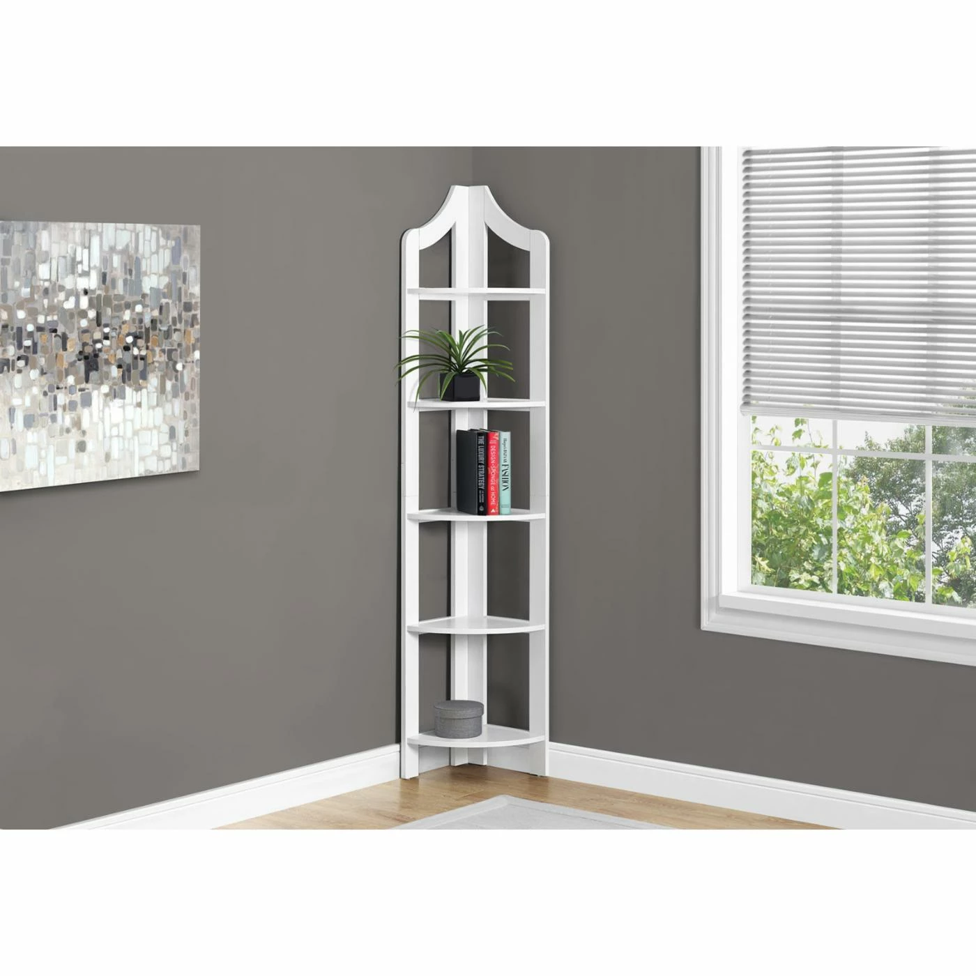 Fill that empty corner space in your hallway, living room, or bedroom with the elegant Monarch Specialties Transitional Corner Bookcase. Offering plenty of storage space with 5 fixed wedge style shelves to place books, pictures, plants, or showcase your decorative objects. The transitional design of this eager is suitable for any dΓ©cor and the compact size makes it ideal for small spaces without sacrificing style. Tipping hardware is included to affix to a wall for further stability. Assembly is required.