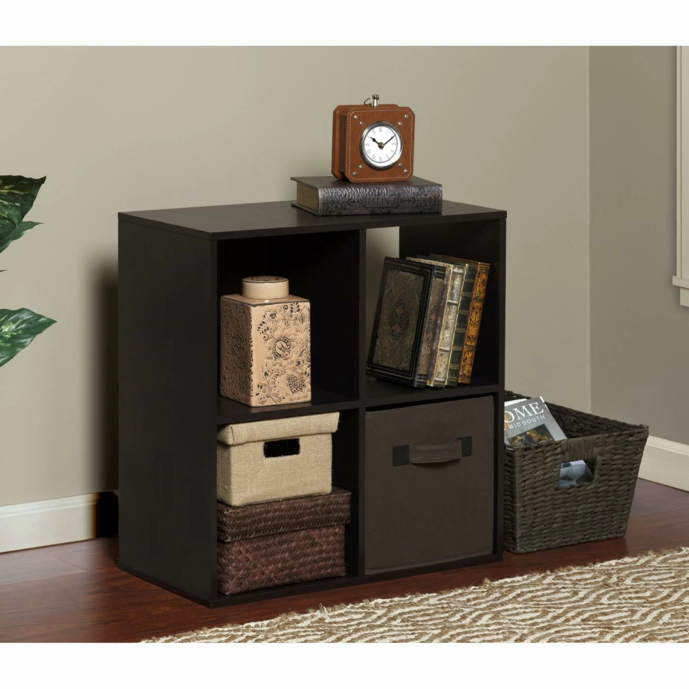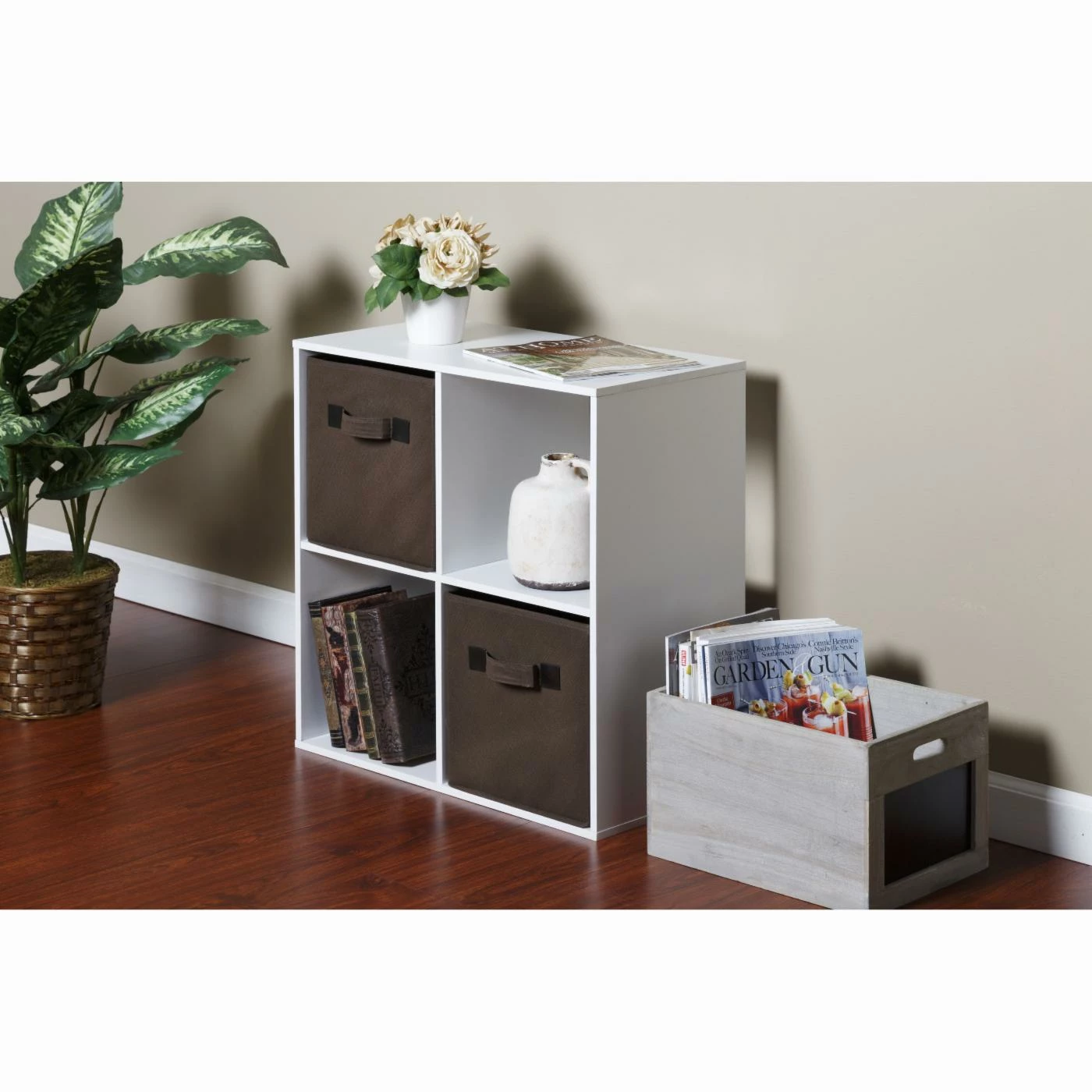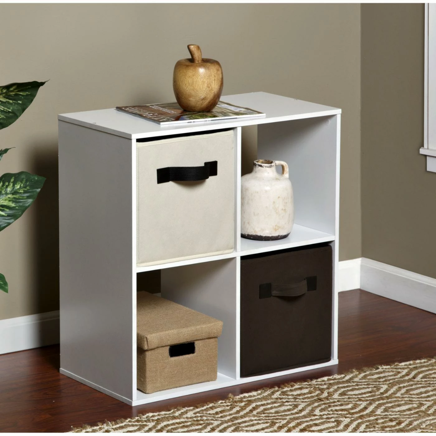 This straightforward OneSpace 4 Cube Organizer Bookcase proudly displays books, keepsakes, and other household items. Finished in white laminate, this case perfectly matches any modern dΓ©cor and each cube can hold one foldable cloth storage cube.