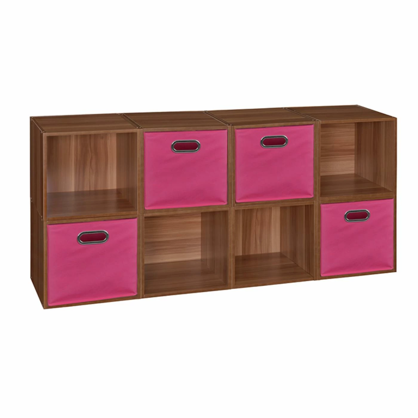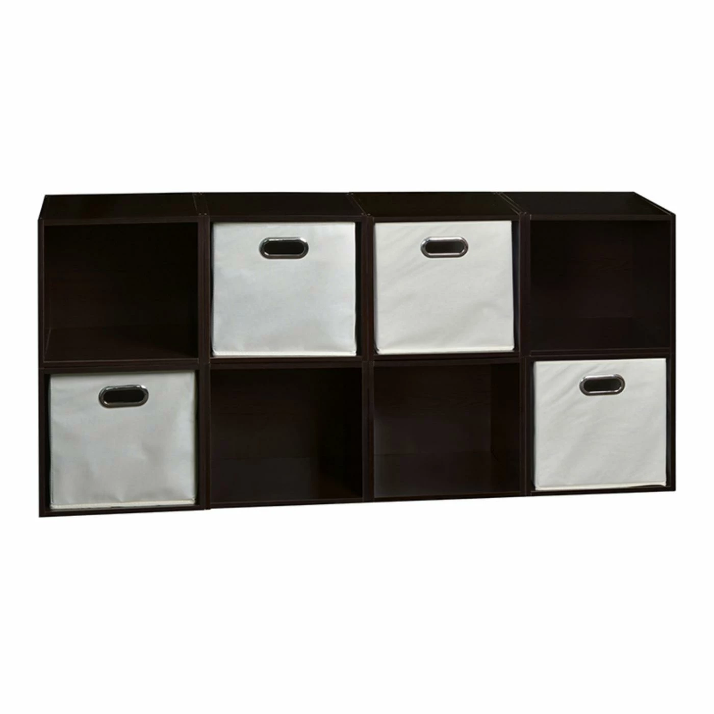 The Regency Niche Cubo Eight Cube Storage Unit with Four Foldable Fabric Storage Bins is ultra-versatile with open spaces for display and heavy-duty bins to hide clutter. This storage unit is crafted of sturdy, durable wood and features four bins crafted of thick fabric with inset chrome handles for easy carrying. Display this cube unit solo or add additional cubes using the spring-pin connectors to create a pyramid, L, or classic rectangular shape.