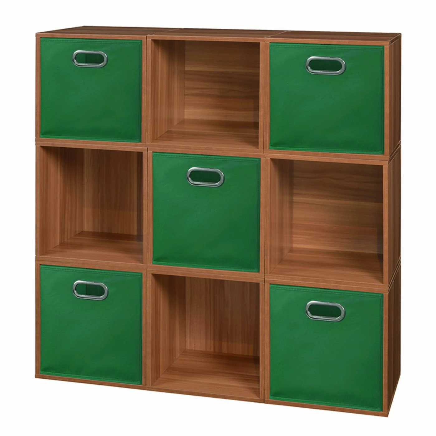 Give your space a clean, uncluttered look with the Regency Niche Cubo Nine Cube Storage Unit with Five Foldable Fabric Storage Bins. The storage bins are outfitted with inset chrome handles to prevent ripping. This modern storage unit is designed with spring-pin connectors that allow you to add more cubes in differing positions to create a custom look. Crafted of sturdy wood, this cube storage unit withstands the test of time and is easily assembled without the use of tools.