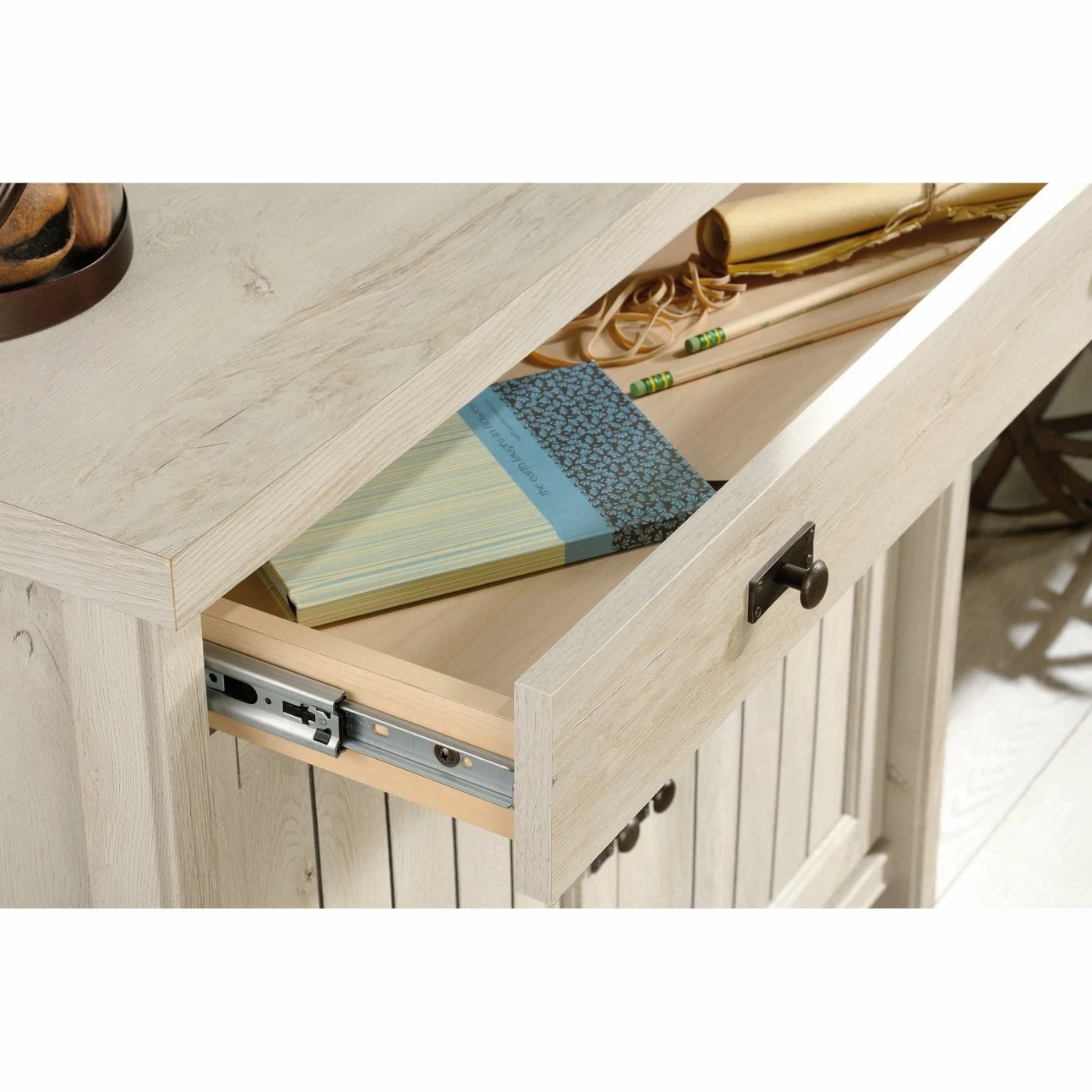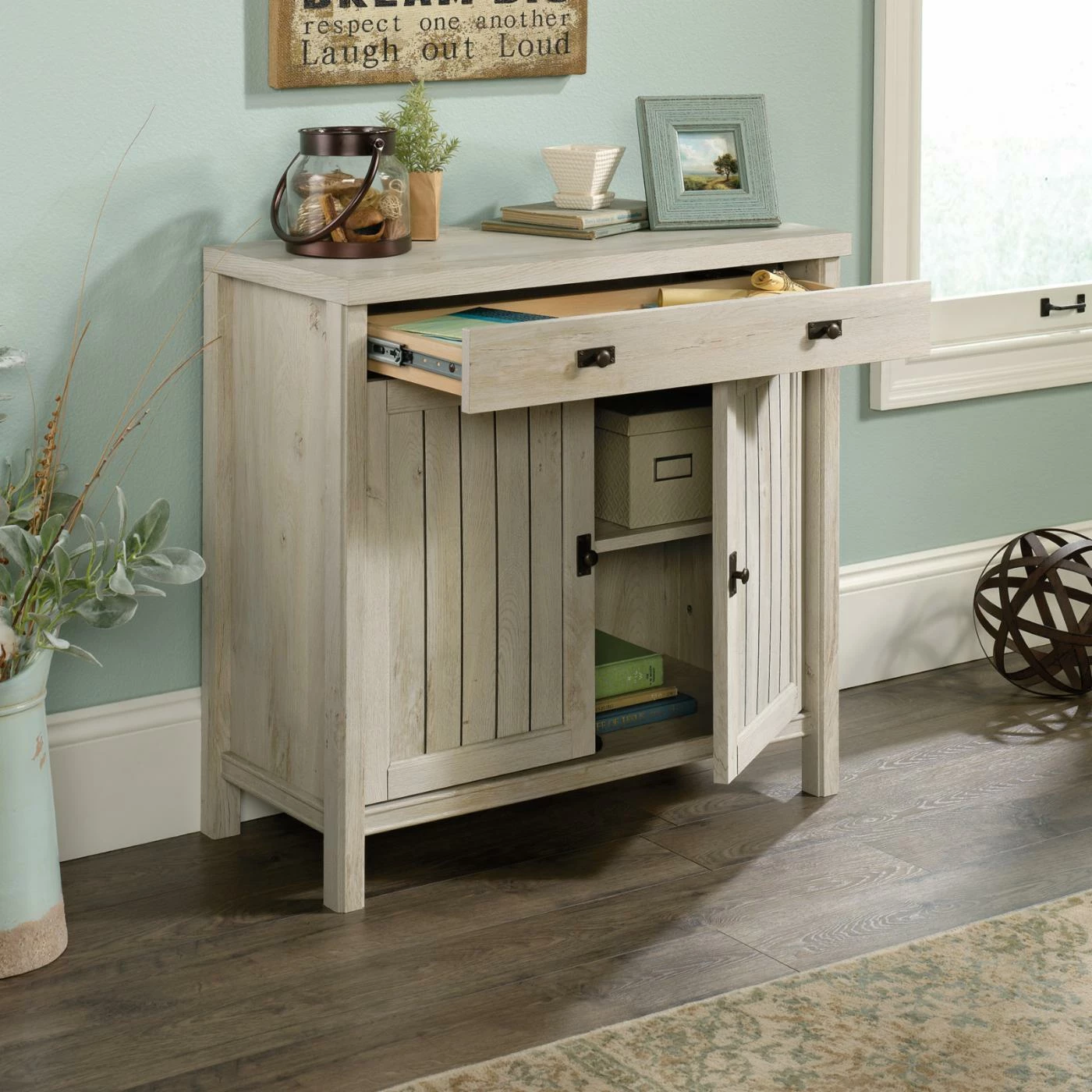 - Easy-glide storage drawer and 2 doors in cabinet